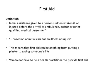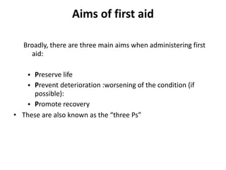 The document provides a comprehensive overview of first aid, including its definition, aims, roles of a first aider, and priorities in emergency situations. It emphasizes the importance of preserving life, preventing deterioration, and promoting recovery, along with assessing casualties and arranging for further medical help. Additionally, it outlines legal and ethical considerations, triage processes, and essential items for a first aid kit.