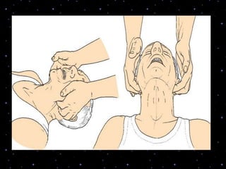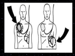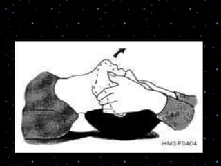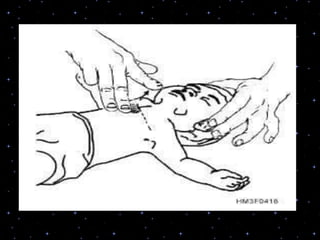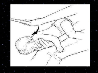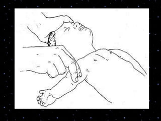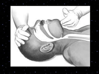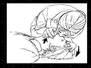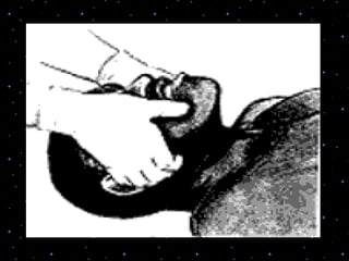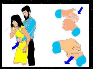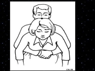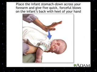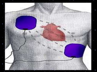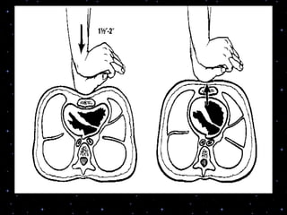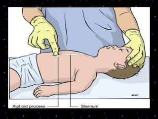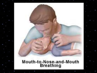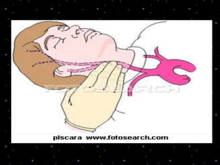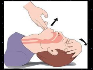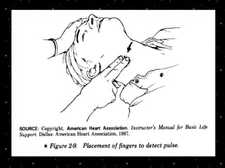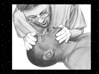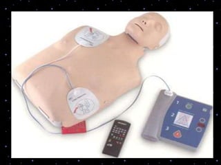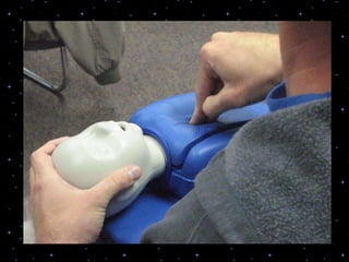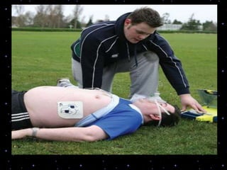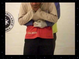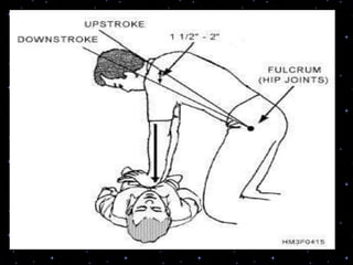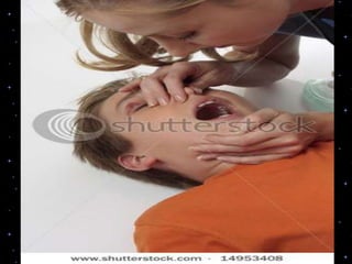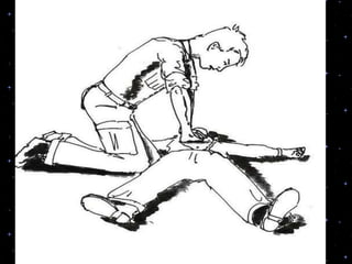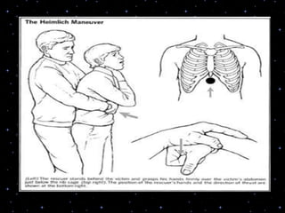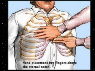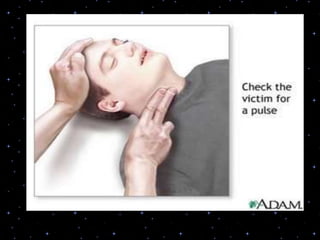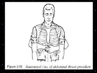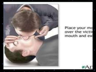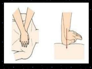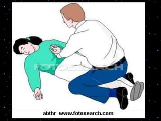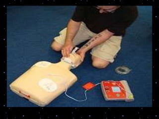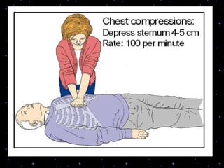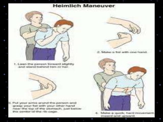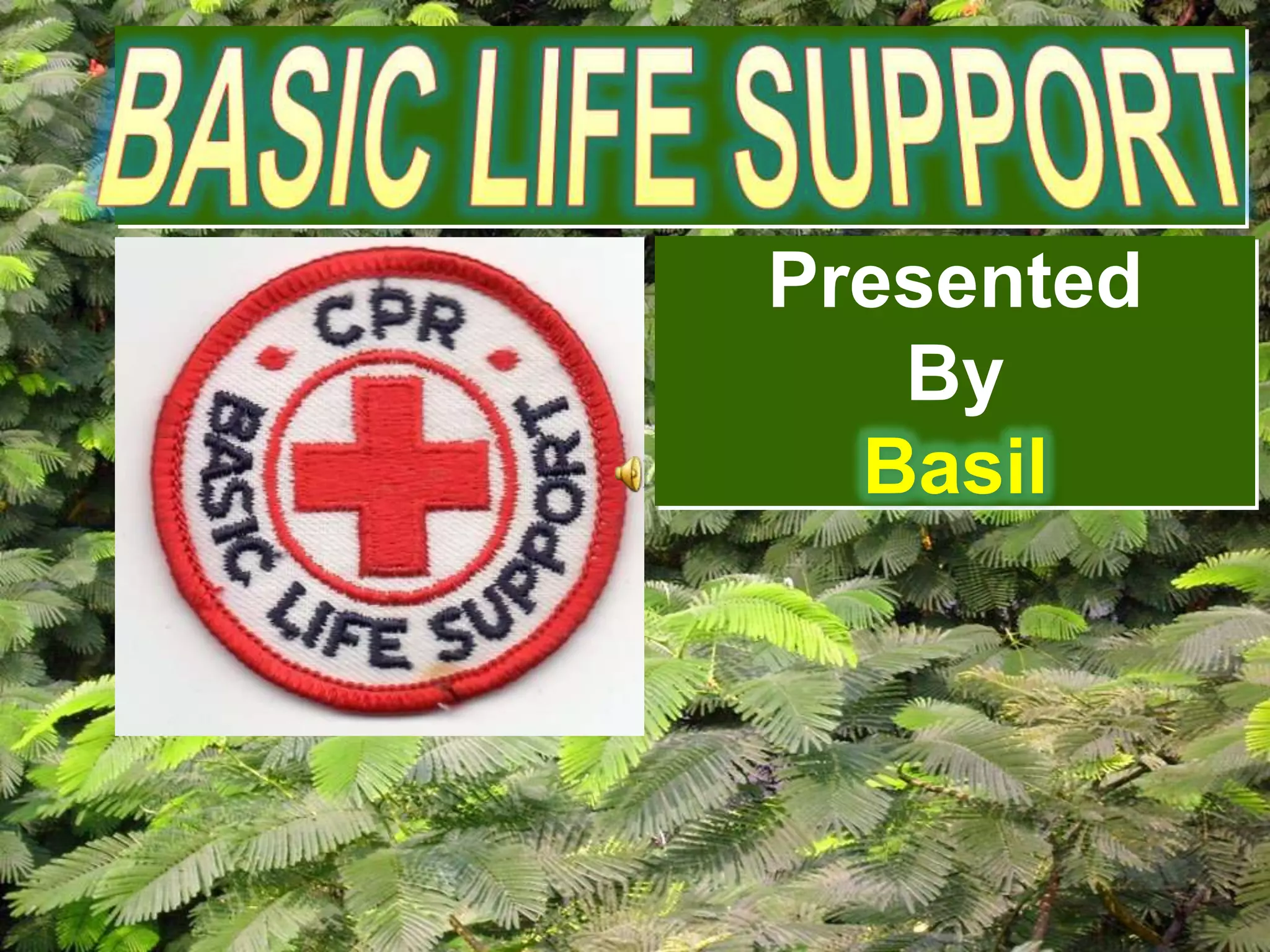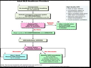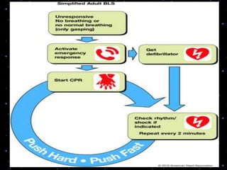 This document provides information on basic life support (BLS) procedures. It begins with an introduction to BLS, which includes immediate recognition of cardiac arrest, activation of emergency services, early CPR, and use of an automated external defibrillator. It then defines BLS and outlines the emergency action principle of assessing safety, doing a primary survey of the victim, activating EMS, and conducting a secondary assessment. The document provides detailed steps for conducting CPR, including chest compressions, opening the airway, giving rescue breaths, and using an AED. It also covers foreign body airway obstruction and procedures for infants.