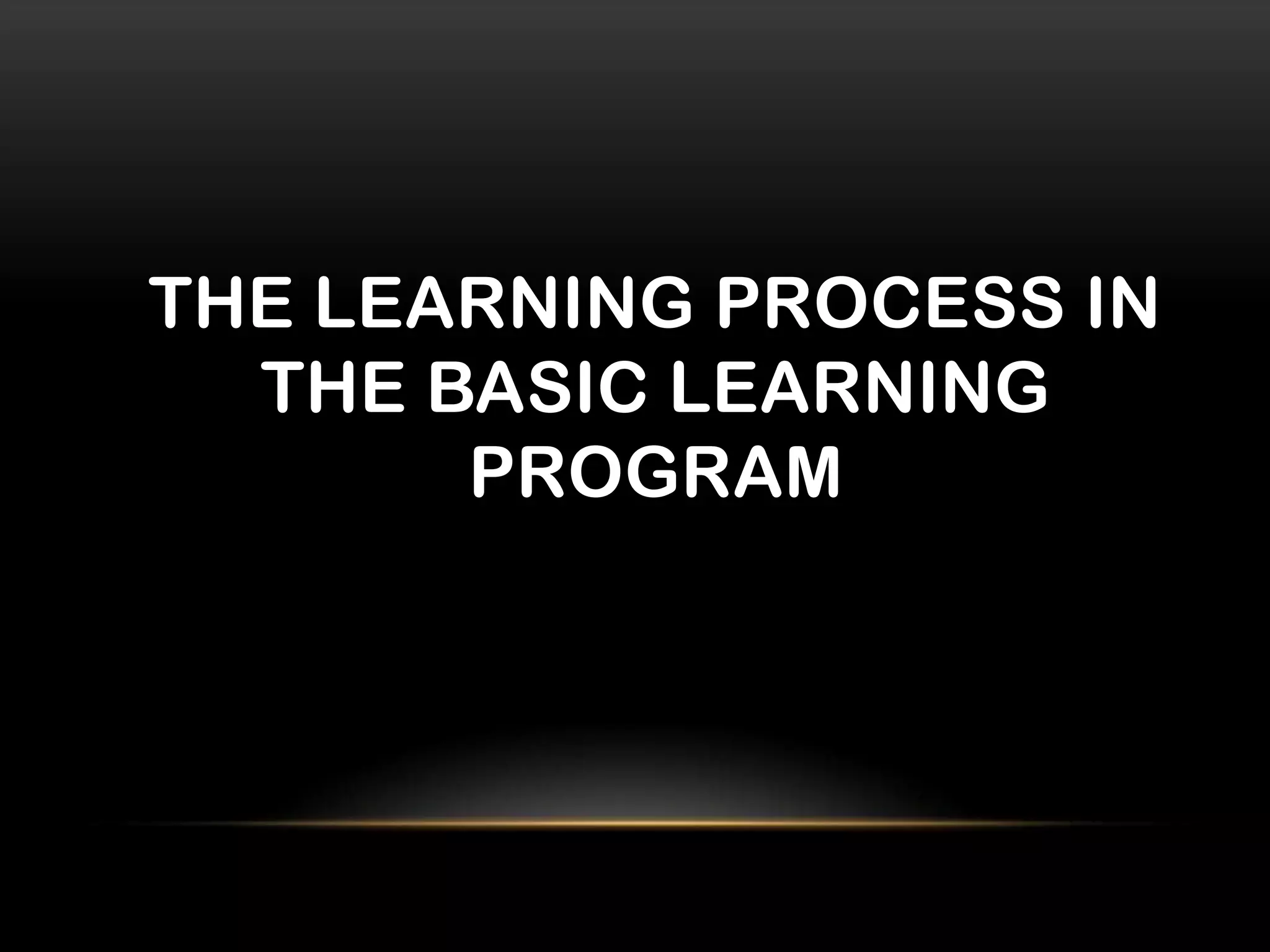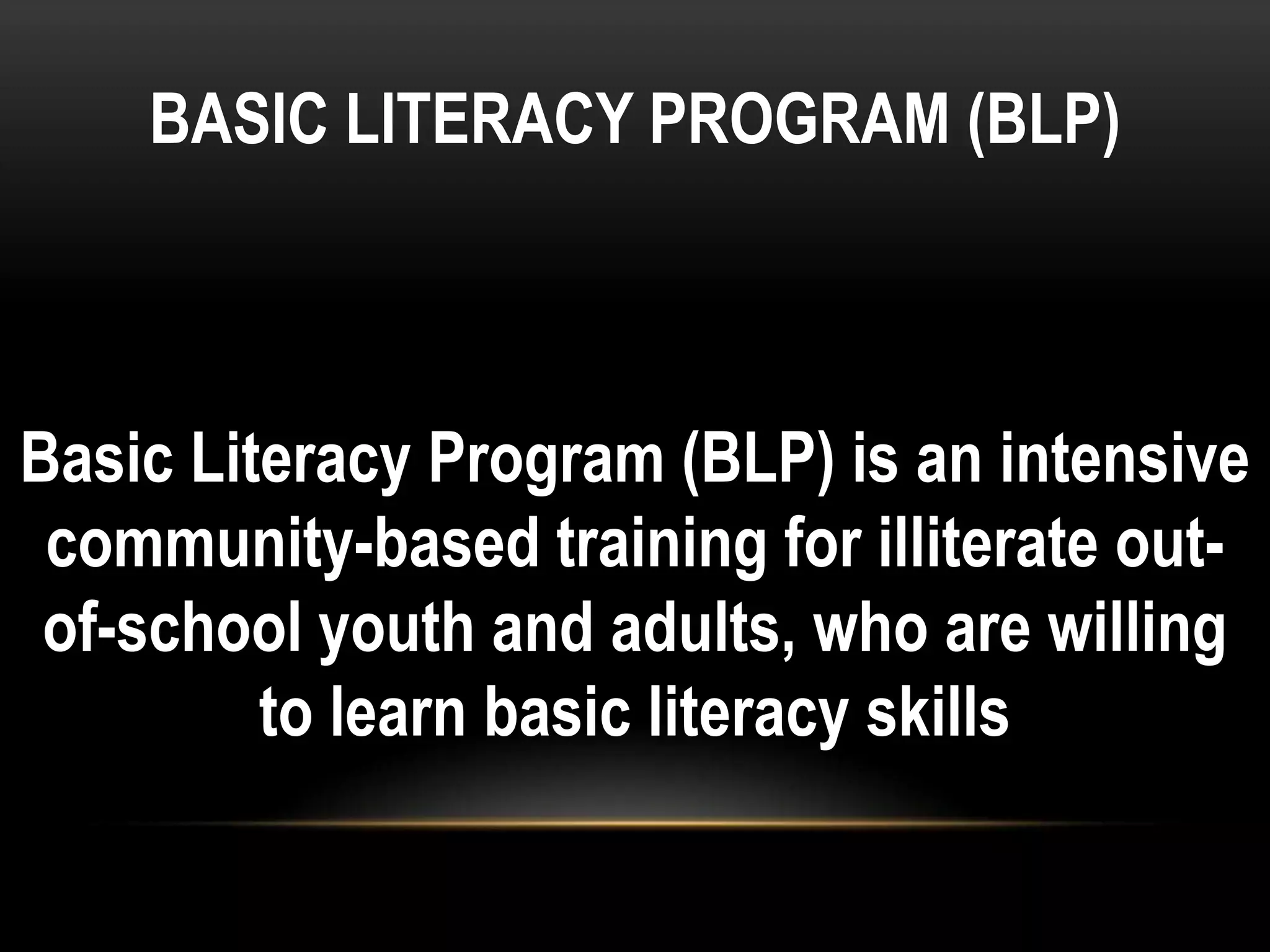 This document summarizes the Basic Literacy Program (BLP) which teaches basic literacy skills to out-of-school youth and adults. It teaches three skills: reading comprehension, basic math, and problem solving. Learners include non-literate individuals, dropouts, and those who don't want formal schooling. The program recruits learners and tests their skills for placement. It uses facilitator-led instruction initially, then transitions learners to self-learning using modules, study groups and home visits. Upon completion, learners can enroll in further education or job programs. The teaching methods include face-to-face, modular, and self-paced learning in local languages depending on the program.