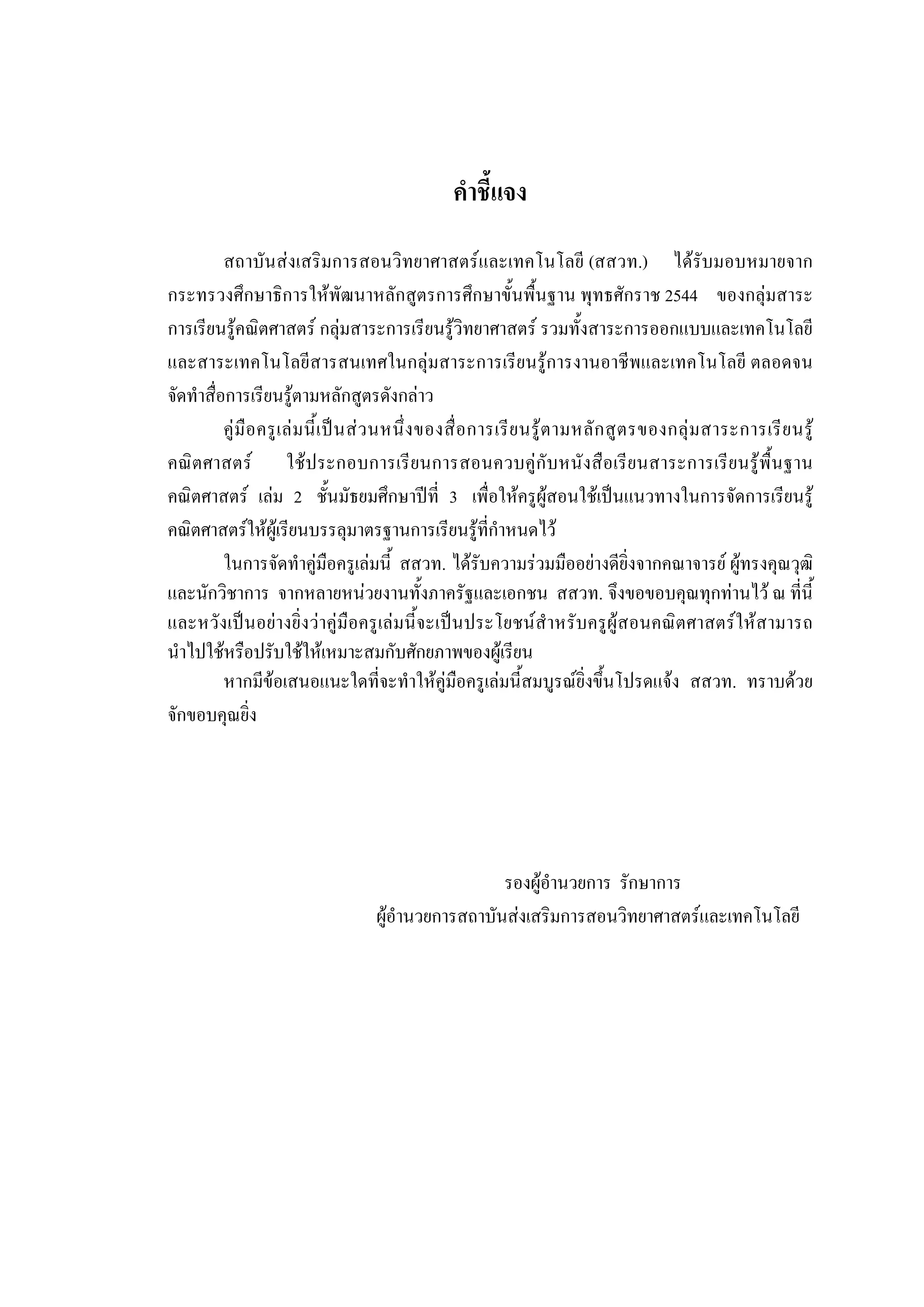 คําชี้แจง สถาบันสงเสริมการสอนวิทยาศาสตรและเทคโนโลยี (สสวท.) ไดรับมอบหมายจาก กระทรวงศึกษาธิการใหพัฒนาหลักสูตรการศึกษาขั้นพื้นฐาน