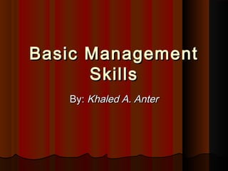 This document provides an overview of basic management skills training. It includes an agenda for the training session from 9am to 2pm, with breaks scheduled. The document outlines course objectives to introduce management functions and responsibilities. It discusses the basic functions of management including planning, organizing, staffing, leading, and controlling. Key management skills such as technical, interpersonal, and conceptual skills are highlighted. The formation of business plans and strategies and their implementation are also summarized.