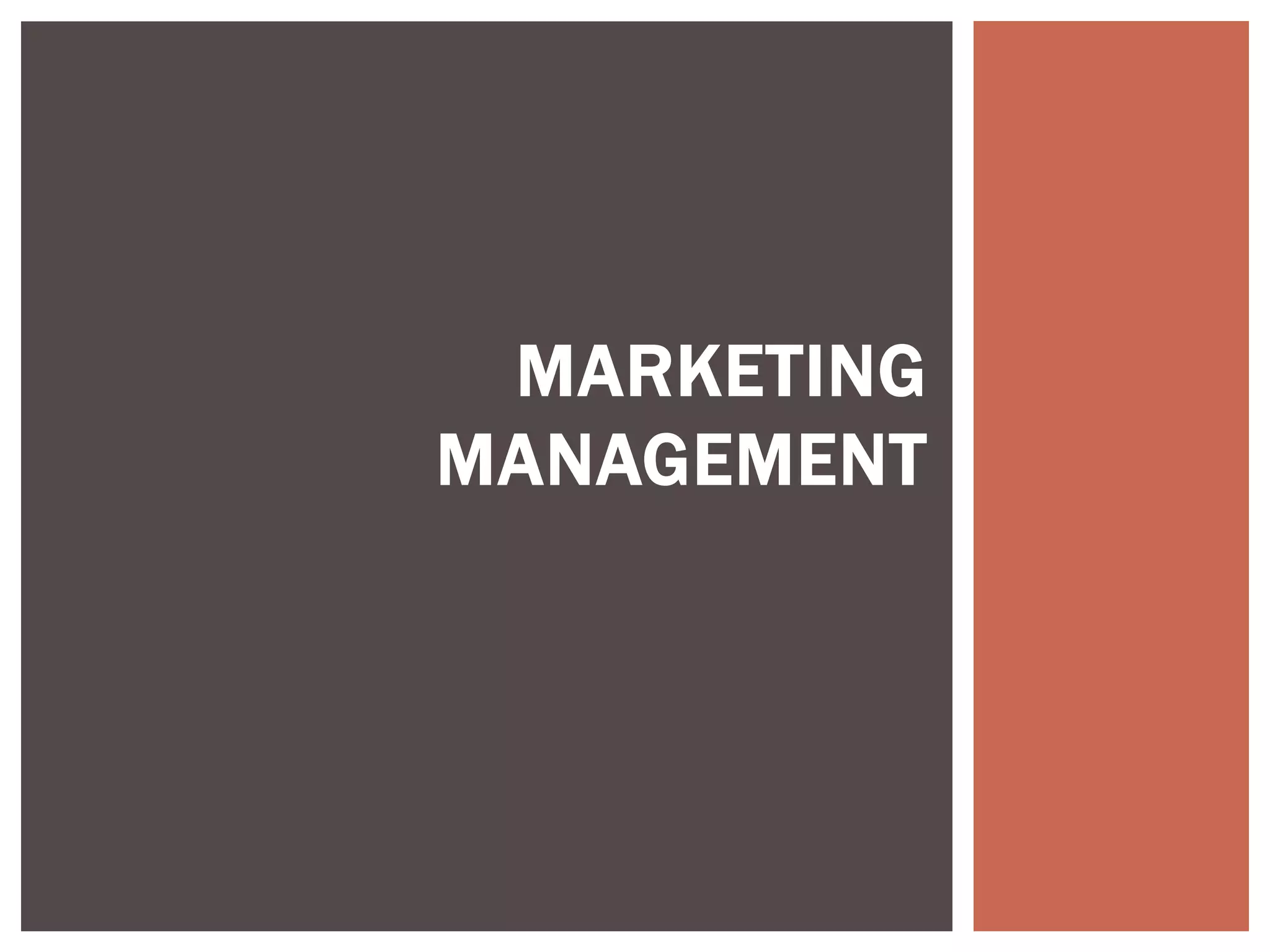 This document defines marketing and marketing management. It discusses that marketing management is the process of planning and executing the conception, pricing, promotion, and distribution of ideas, goods, and services. The goal is to create exchanges that satisfy individual and organizational objectives. Marketing management is also defined as choosing target markets and getting, keeping, and growing customers by creating, delivering, and communicating superior customer value. Marketing can involve goods, services, events, people, organizations, ideas and more. The document also outlines the marketing research process including defining problems and objectives, developing a research plan, implementing the plan, interpreting findings, and reporting them.