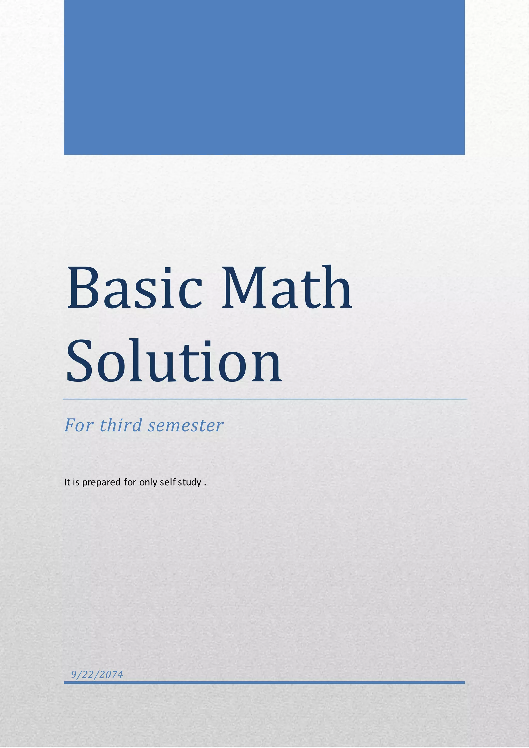 This document contains information about basic math solutions for the third semester intended for self-study. It includes sample solutions to exercises on elementary group theory, including determining if a set forms a group based on properties like closure, identity, and inverses. It also contains multiplication tables and worked examples of checking properties for specific sets and binary operations.