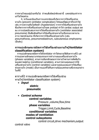 āļĢāļ°āļ§āļąāļāđāļĨāļ°āļāđāļāļāļāļąāļāļ āļēāļ§āļ°āđāļāļĢāļāļāđāļāļāļāļĩāđāđāļāļīāļāļāļēāļāļāļēāļĢāđāļāđāđāļāļĢāļ·āđāļāļāļāđāļ§āļĒ āļŦāļēāļĒāđāļ (prevent ventilator complication) āđāļŦāđāļāđāļāļĒāļāļĩāđāļŠāļļāļāđāļāđāļēāļāļĩāđāļāļ°āļāļģāļēāđāļāđ āđāļāđāļ āļ āļēāļ§āļ°āļāļ§āļēāļĄāļāļąāļāđāļĨāļŦāļīāļāļāļģāđāļē (hypotension) āļāļēāļāļāļēāļĢāđāļāđāđāļāļĢāļ·āđāļāļāļāđāļ§āļĒāļŦāļēāļĒāđāļ āļāļķāđāļāđāļāļīāļāļāļēāļāļāļēāļĢāļāļĩāđāđāļāļĢāļ·āđāļāļāļāđāļ§āļĒāļŦāļēāļĒāđāļāļĨāļ preload āļāļģāļēāđāļŦāđ cardiac output āļĨāļ āļĨāļ āļ āļēāļ§āļ°āļāļāļāļāļąāļāđāļŠāļāļāļēāļāļāļēāļĢāđāļāđāđāļāļĢāļ·āđāļāļāļāđāļ§āļĒāļŦāļēāļĒāđāļ (ventilator associated pneumonia) āļāļķāđāļāļŠāļąāļĄāļāļąāļāļāđāļāļąāļāļāļēāļĢāđāļāđāđāļāļĢāļ·āđāļāļāļāđāļ§āļĒāļŦāļēāļĒāđāļāđāļāđāļāļĢāļ°āļĒāļ°āđāļ§āļĨāļēāļāļēāļ āļ āļēāļ§āļ° barotrauma āļāļĩāđāđāļāļīāļāļāļēāļāļāļēāļĢāđāļāđāđāļāļĢāļ·āđāļāļāļāđāļ§āļĒāļŦāļēāļĒāđāļ (āđāļāđāļ pneumothorax, pneumomediastinum, subcutaneous emphysema āđāļāđāļāļāđāļ) āļāļēāļĢāđāļāđāļāļĨāļąāļāļĐāļāļ°āļāļāļīāļāļāļēāļĢāđāļāđāđāļāļĢāļ·āđāļāļāļāđāļ§āļĒāļŦāļēāļĒāđāļ(Ventilator classification system) āļāļēāļĢāđāļāđāļāļĨāļąāļāļĐāļāļ°āļāļāļīāļāļāļēāļĢāđāļāđVentilator āļāļģāļēāđāļāđāļŦāļĨāļēāļĒāļ§āļīāļāļĩāļāļąāļāļāļēāļĢāļēāļāļāļĩāđ2 āđāļāđ āļāļēāļĢāđāļāđāļāļāļēāļĄāļĨāļąāļāļĐāļāļ°āļ§āļāļāļĢāļāļāļāļĢāļ°āļĒāļ°āļāļēāļĢāļāļģāļēāļāļēāļāļāļāļāđāļāļĢāļ·āđāļāļāļāđāļ§āļĒāļŦāļēāļĒāđāļ (phases variables), āļāļēāļĄāļāļēāļĢāđāļĨāļ·āļāļāļĨāļąāļāļĐāļāļ°āļāļēāļĢāļŦāļēāļĒāđāļāļāļēāļĄāļāļēāļĢāļāļąāļāļŠāļīāļāđāļ āļāļāļāļŠāļ āļēāļāļāļđāđāļāđāļ§āļĒ (conditional variables), āļāļēāļĄāļāļēāļĢāļāļ§āļāļāļļāļĄāļāļāļāļāļēāļĢāđāļāđ āđāļāļĢāļ·āđāļāļāļāđāļ§āļĒāļŦāļēāļĒāđāļ (control variables) āđāļĨāļ°āļāļēāļĄāļĢāļđāļāđāļāļāļāļāļāļāļēāļĢāđāļāđāđāļāļĢāļ·āđāļāļ āļāđāļ§āļĒāļŦāļēāļĒāđāļ (mode) āđāļāđāļāļāļēāļĢāđāļāđāļāļāļĩāđāđāļāđāļĢāļąāļāļāļ§āļēāļĄāļāļīāļĒāļĄāđāļāļĢāđāļŦāļĨāļēāļĒāļāļķāđāļāļāļ°āļāļāļāļĨāđāļēāļ§ āđāļāļāļĩāđāļāļĩāđ āļāļēāļĢāļēāļāļāļĩāđ2 āļāļēāļĢāđāļāđāļāļĨāļąāļāļĐāļāļ°āļāļāļīāļāļāļēāļĢāđāļāđāđāļāļĢāļ·āđāļāļāļāđāļ§āļĒ āļŦāļēāļĒāđāļ(Ventilator classification system) âĒ Input eletric pneumatic âĒ Control scheme control variables Pressure ,volume,flow,time phase variables Trigger,Limit,Cycle,Baseline conditional variables modes of ventilation control subsystems control circuit,drive mechanism,output control valve