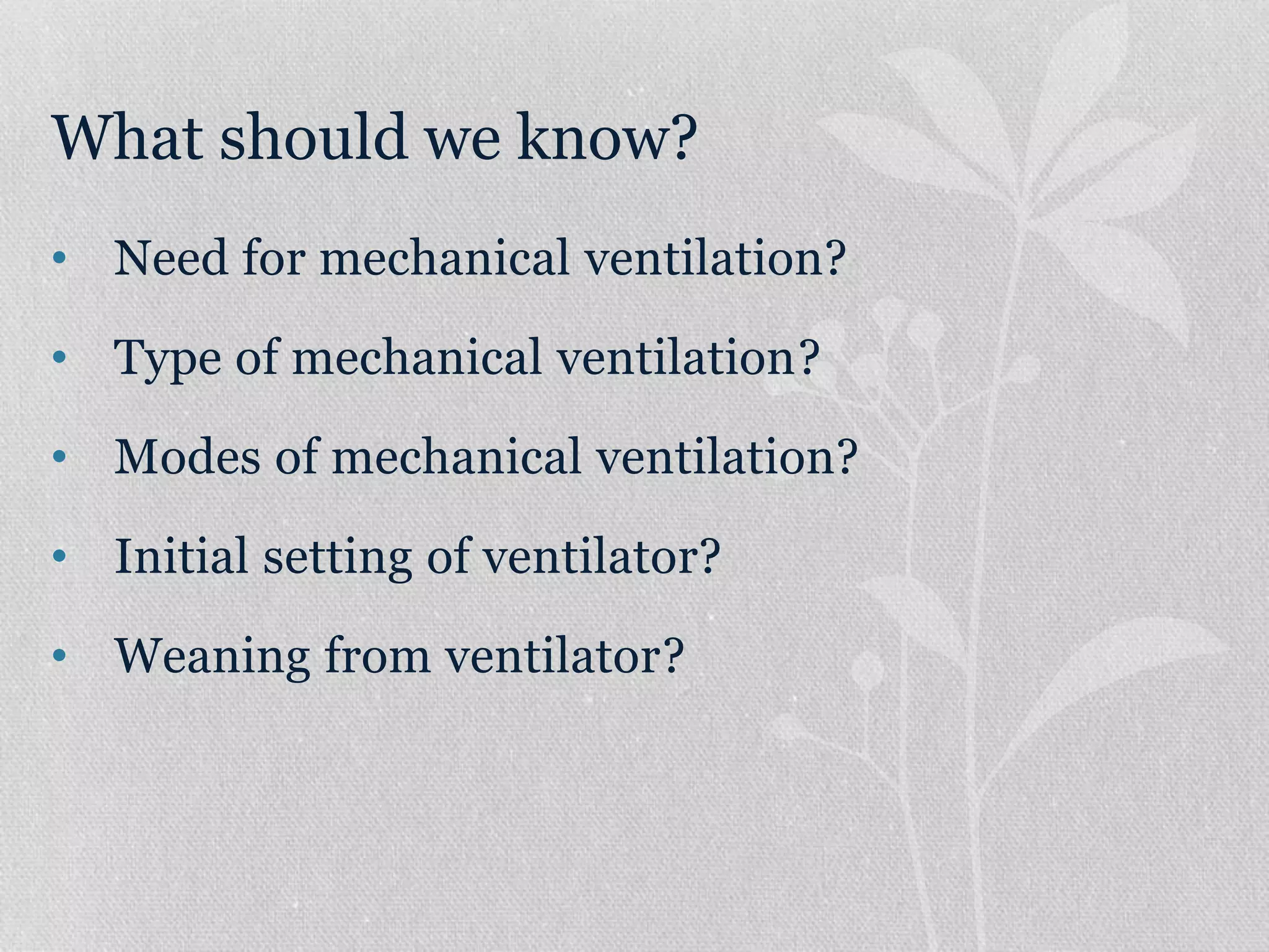 2. Initial ventilator settings should aim for adequate oxygenation and ventilation while minimizing work of breathing. Settings like tidal volume, respiratory rate, and PEEP are adjusted based on factors like patient size and condition.