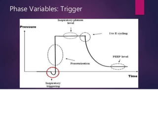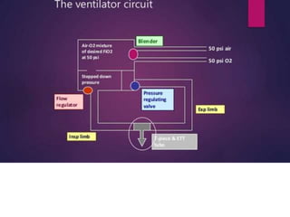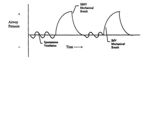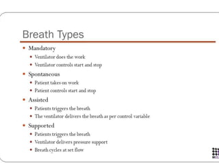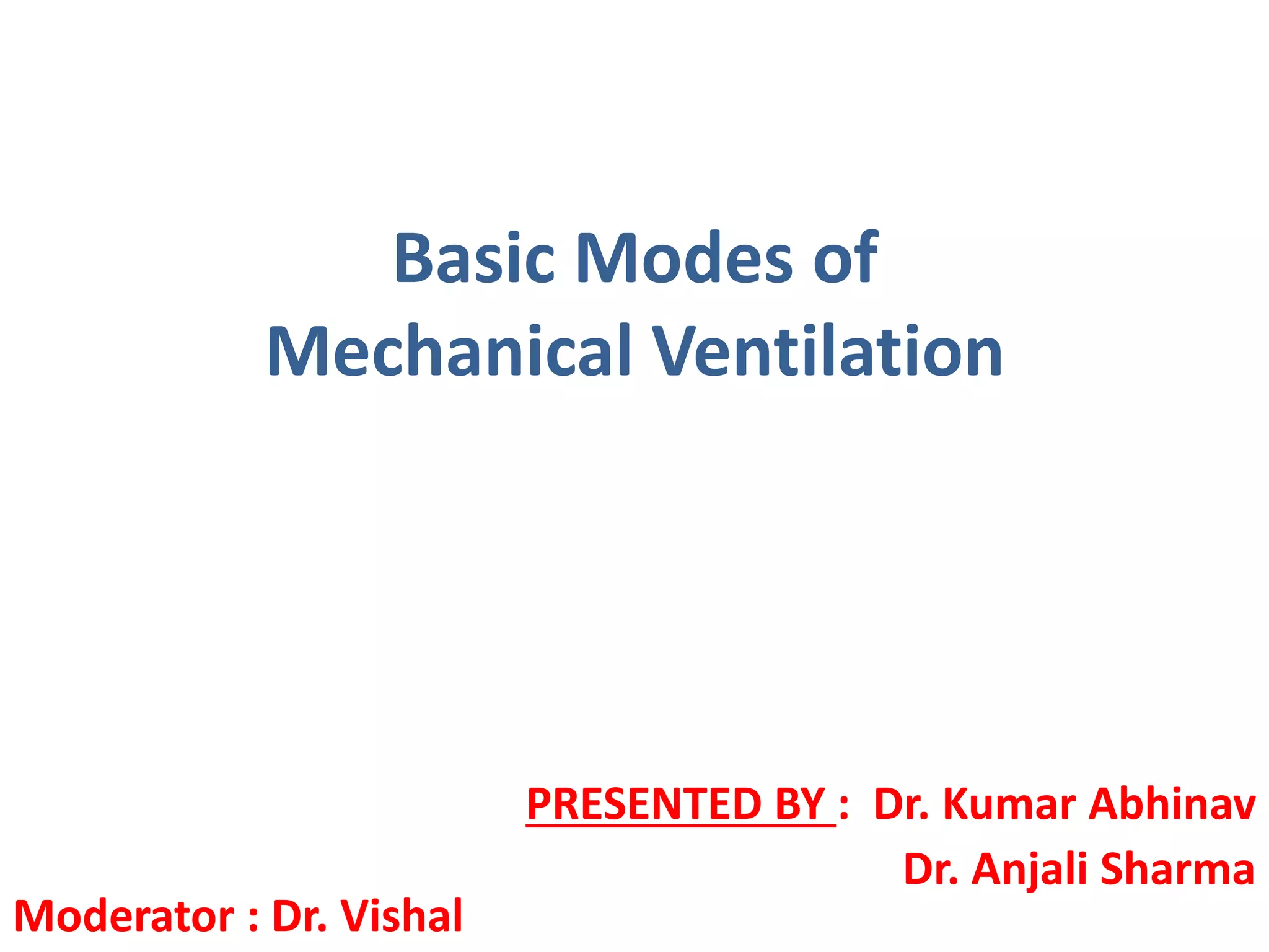 This document discusses different modes of mechanical ventilation. It begins by introducing mechanical ventilation and its purpose of providing respiratory support. It then describes the basic components of a ventilator and ventilator circuit. The document outlines several modes of mechanical ventilation including controlled mechanical ventilation, assist-control ventilation, intermittent mandatory ventilation, and synchronized intermittent mandatory ventilation. It provides details on the characteristics, advantages, and disadvantages of each mode.