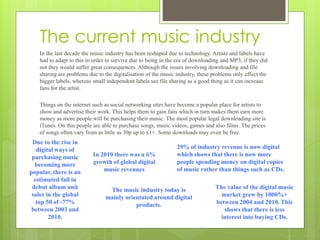 The document discusses how the music industry has changed in recent decades due to digitalization and the rise of downloading/file sharing. It notes that major labels have struggled to adapt while independent labels have seen opportunities. Live music remains important for promotion and revenue. Digital sales now account for 29% of industry revenue, with streaming and downloads replacing physical formats. Issues around piracy and its impact on sales continue to challenge the industry's business model. The future will rely on new approaches and artists having more control over their careers.