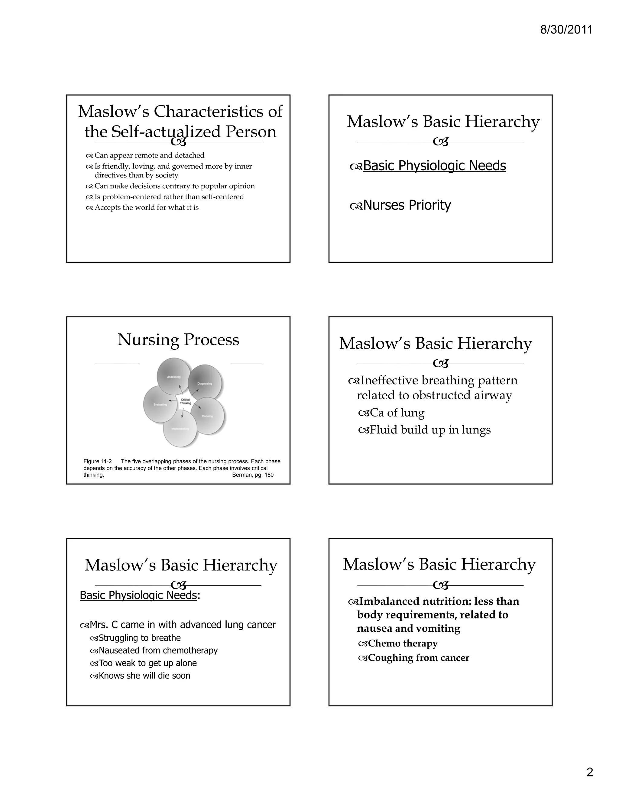 This document discusses Abraham Maslow's hierarchy of needs and its application in nursing. It begins by outlining Maslow's five levels of needs - physiological, safety, love/belonging, esteem, and self-actualization. It then provides examples of how nurses assess and address patients' basic needs according to Maslow's hierarchy, such as meeting physiological needs like nutrition and hygiene. The document also discusses concepts like health, illness, and wellness, and factors that influence health behaviors.