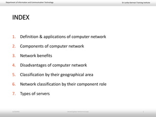 This document provides an introduction to basic network concepts. It defines a computer network and its components, which include two or more interconnected computers, cables, network interface cards, switches, and operating systems. It describes the applications and benefits of networks, such as sharing resources and communicating over long distances, as well as some disadvantages like high installation costs. It also classifies networks based on their geographical area into personal, local, metropolitan and wide area networks. Finally, it discusses peer-to-peer and client-server network models.