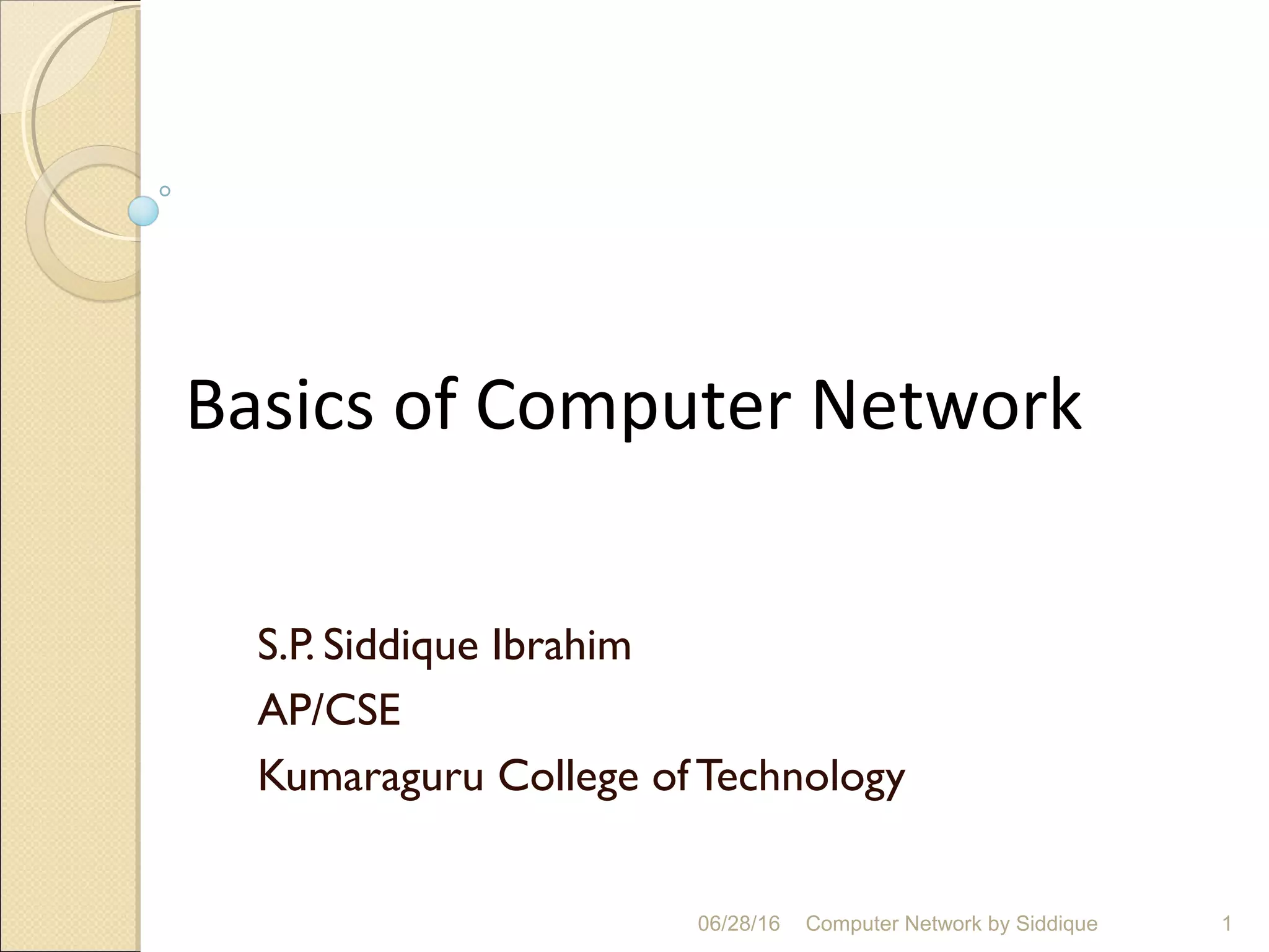 The document discusses basics of computer networks. It defines data communication and its key characteristics like delivery, accuracy and timeliness. The basic components of a communication model are identified as the message, protocol, sender, receiver and transmission medium. Different data types like text, numbers, images, audio and video are represented as bit patterns for transmission. Types of networks like personal area network, local area network, wide area network, campus area network and metropolitan area network are classified based on their geographical span, interconnectivity, administration and architecture.