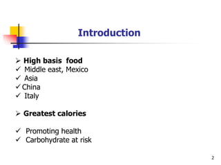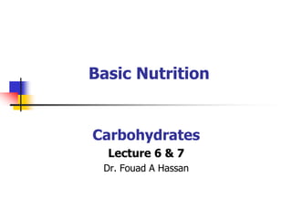 The document discusses the role of carbohydrates in nutrition, categorizing them into simple and complex types, and highlighting the importance of unrefined sources like whole grains for a healthy diet. It explains carbohydrate digestion, the implications of refined sugars on health, and provides guidelines on daily carbohydrate intake. Additionally, it covers dietary fiber, its types, benefits, and recommended daily quantities.