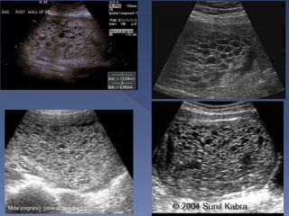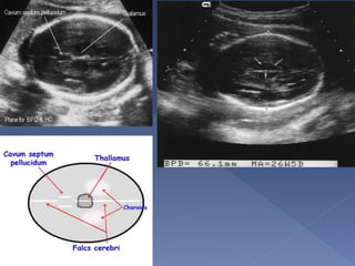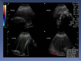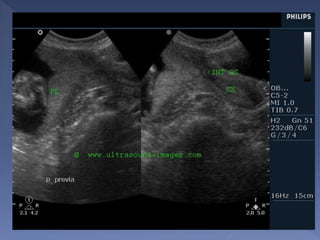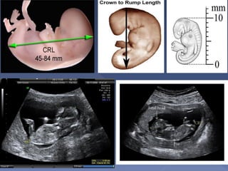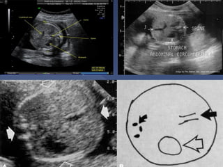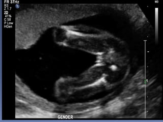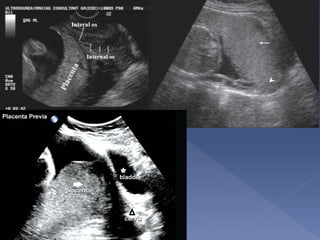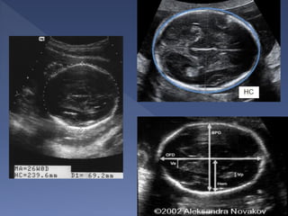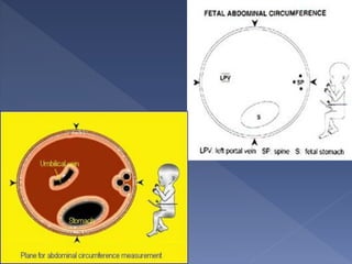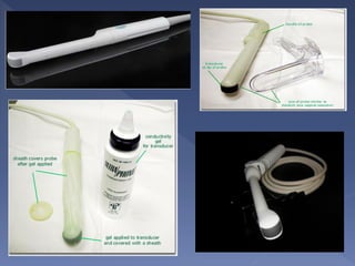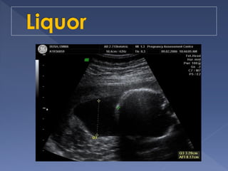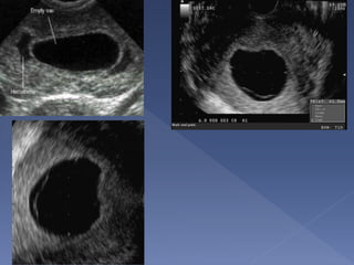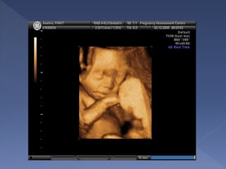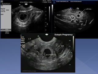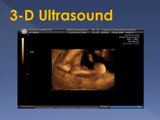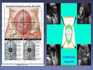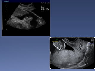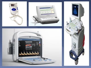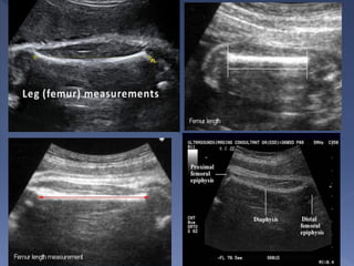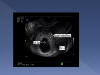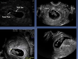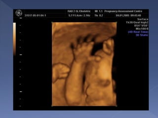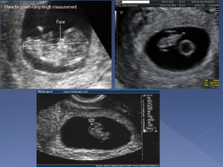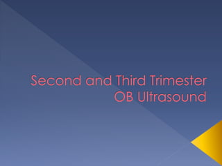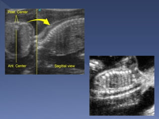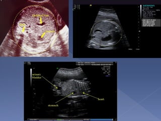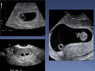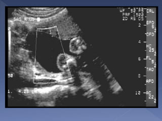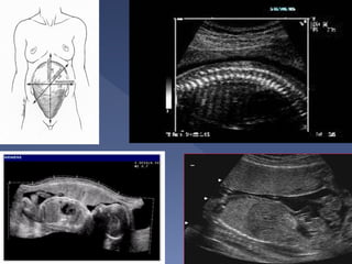 The document discusses the use and safety of ultrasound in obstetrics and gynecology, detailing its different types and applications, including its role in diagnosing pregnancy conditions and fetal health. Key topics include gestational dating accuracy, detection of ectopic pregnancies, and monitoring fetal well-being through various measurement techniques and imaging systems. The document also addresses the importance of using appropriate methods for effective evaluations and outlines the clinical significance of ultrasound findings.