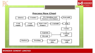 The RK Group started in marble business in 1989 and achieved great success, being listed in the Guinness Book of World Records as the world's largest marble producer. Wonder Cement is part of RK Group. Wonder Cement is expanding its capacity to 12 MTPA by setting up new production lines and grinding units. The document then provides details about Wonder Cement's manufacturing process and quality control systems to produce high quality cement.