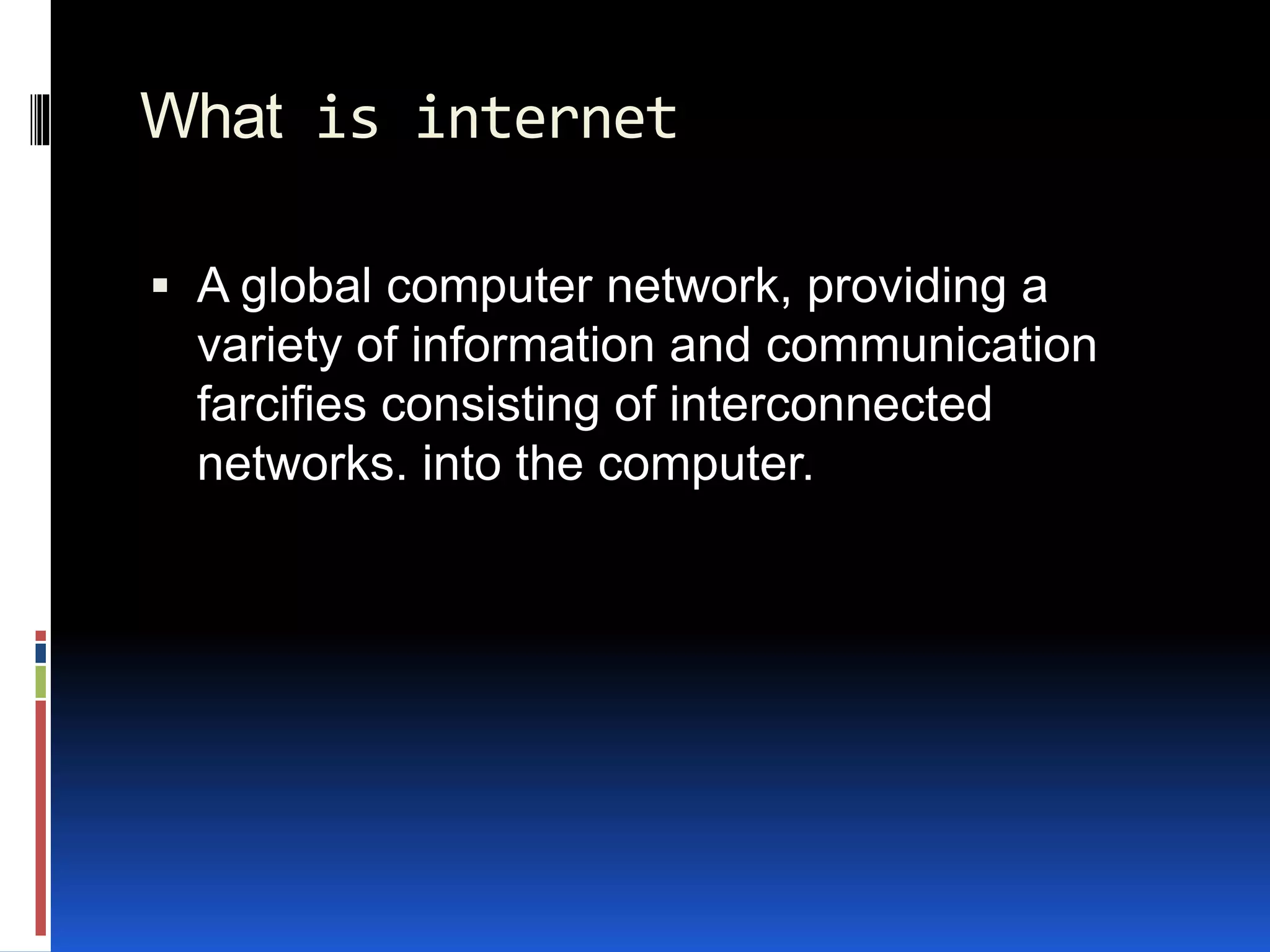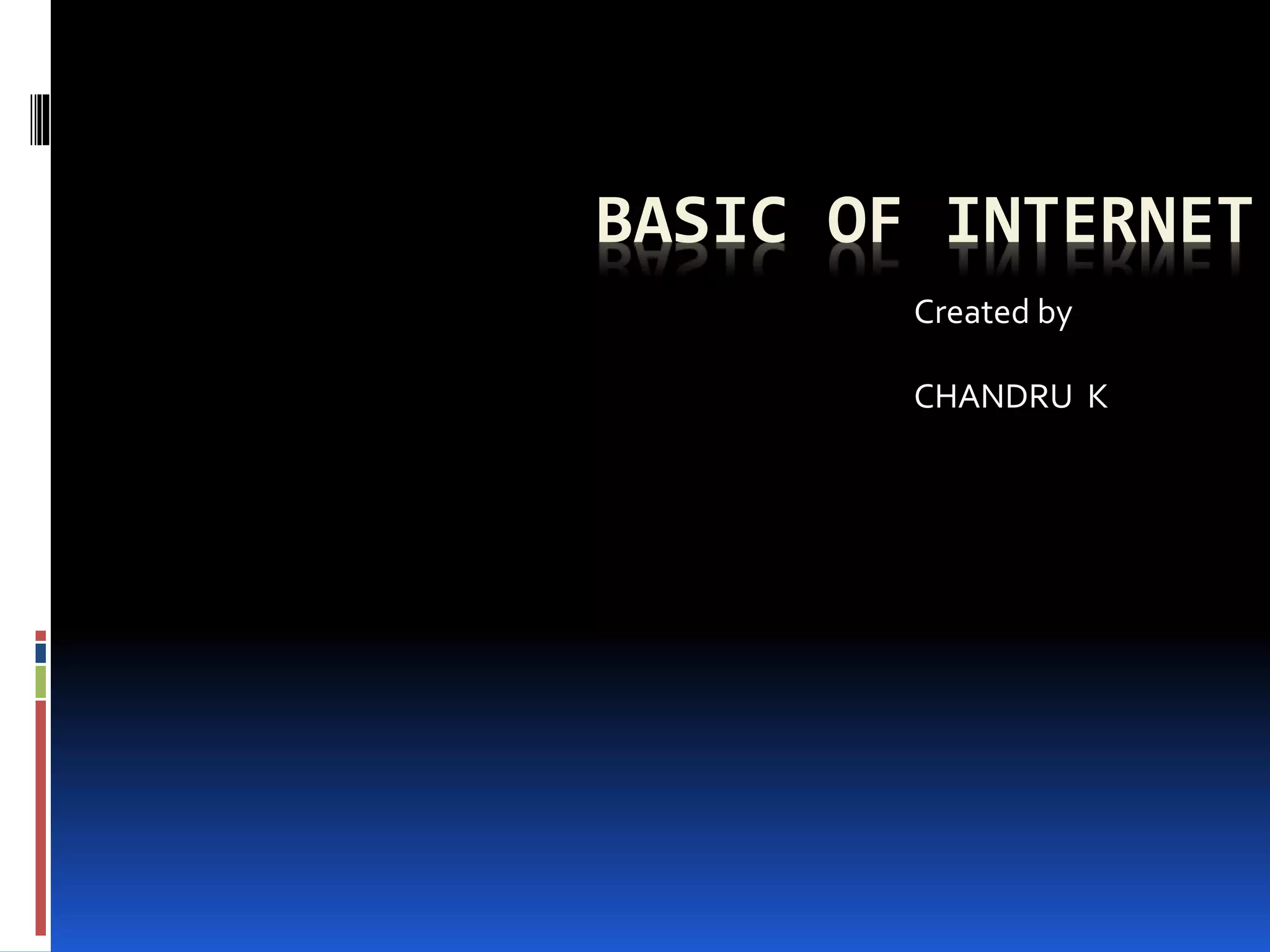 The document provides an overview of basic concepts related to the internet. It defines the internet as a global network of interconnected computer networks that provides various information and communication facilities. It explains that the internet allows users to search for information using powerful search engines, communicate with others via chat or email, and get latest news from around the world. It also defines local area networks (LANs) and wide area networks (WANs) as private networks within a small geographical area or connecting resources over a larger geographic region, respectively. Metropolitan area networks (MANs) connect buildings across a city. Web browsers like Firefox, Internet Explorer, and Conqueror are applications used to access the internet.