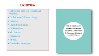 This document discusses climate change, defining it as changes in long-term weather patterns caused by both natural and human factors that increase greenhouse gases. It outlines the main greenhouse gases, their sources, and their effects on trapping heat. Deforestation is another significant cause of climate change. Evidence of climate change includes rising global temperatures, melting glaciers and rising sea levels, increased ocean acidification, and changes to rainfall patterns and extreme weather events. Preventing further climate change will require both reducing greenhouse gas emissions through mitigation efforts as well as adapting to the changes already occurring through climate adaptation strategies.
