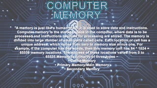 The document provides an extensive overview of computer basics, emphasizing their accuracy, speed, and versatility in performing various tasks without fatigue. It differentiates between hardware, software, and various input/output devices while explaining CPU functions, memory types, and different categories of computers, including analog, digital, and hybrid systems. Additionally, it outlines storage devices and their uses, highlighting the distinct features of mainframe, mini, and microcomputers.