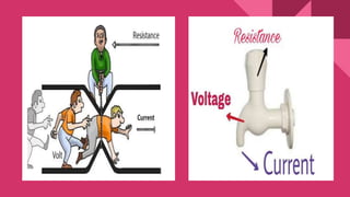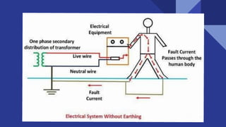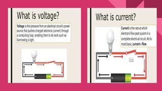 A circuit requires three components: a voltage source, a conductive path, and a resistor. Resistance is a measure of opposition to current flow and is measured in ohms. There are different methods for earthing electrical conductors, such as using a copper or galvanized plate buried underground or a galvanized steel pipe in the ground. Electrical plugs and sockets come in different configurations depending on the number of pins, with three-pin plugs having an earthing pin, live pin, and neutral pin.