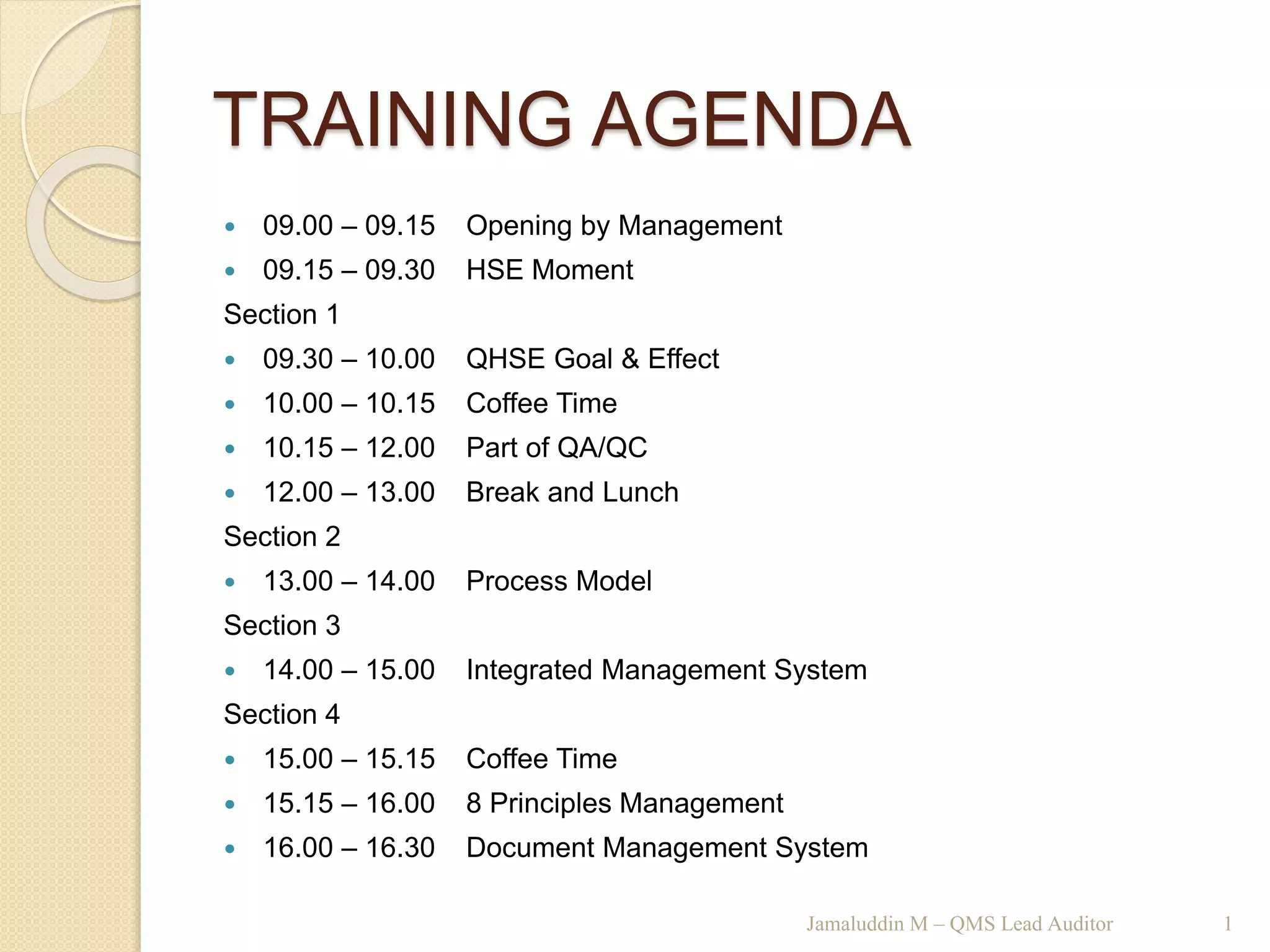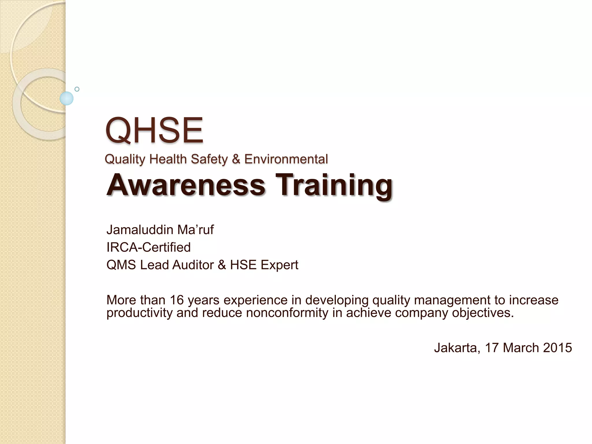 This training document outlines an agenda for a QHSE (Quality Health Safety & Environmental) Awareness Training presented by Jamaluddin Ma’ruf. The one-day training covers topics such as QHSE goals and effects, quality assurance and control, hazard identification, and integrated management systems. It discusses process models for ISO 9001, OHSAS, and ISO 14001 standards. Eight principles of management are also reviewed, including customer focus, leadership, involvement of people, and continual improvement. The training aims to help audiences understand basic concepts of integrated management systems.
