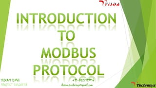 Shivam Singh is a project engineer who provides his contact information. The document discusses MODBUS, an application layer messaging protocol that provides client/server communication between devices. MODBUS can operate over serial lines or TCP/IP networks and uses function codes to specify request and response transactions. It describes the MODBUS protocol data unit structure, addressing model, and typical network architecture with MODBUS clients, servers, and gateways connecting different device types and networks.