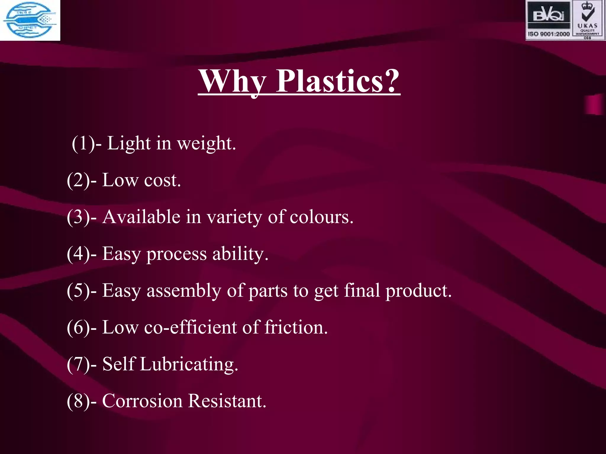 This document discusses various types of plastics and polymers. It provides 13 reasons why plastics are commonly used, including being lightweight, low cost, and available in various colors and forms. It then covers polymerization processes and how monomers link together to form polymers. The rest of the document categorizes and classifies different types of polymers based on their structure, manufacturing method, processing type, crystallinity, and applications. Key polymer types discussed include polyethylene, polypropylene, polyvinyl chloride, polystyrene, nylons, and rubbers.
