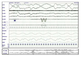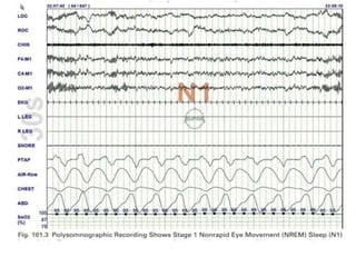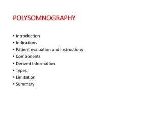 Polysomnography is a multi-parameter test used to diagnose sleep disorders. It involves the simultaneous recording of biophysiological changes that occur during sleep including brain waves, eye movements, muscle activity, heart rate, respiration, and oxygen levels. Key components measured include EEG, EOG, EMG, respiratory effort, airflow, oximetry. Together these provide information about sleep stages and identify disorders like sleep apnea, narcolepsy, restless leg syndrome. Polysomnography is performed in a sleep lab with technicians monitoring the patient overnight.