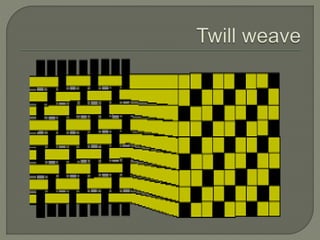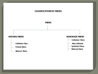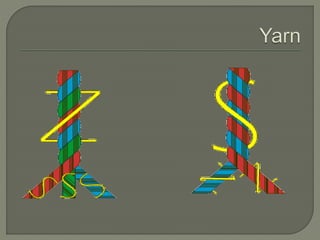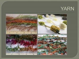 The document discusses different types of yarns used in textiles, including their construction and properties. It describes simple yarns made of twisted fibers, ply yarns made by twisting multiple simple yarns together, and cabled yarns made by twisting ply yarns with opposite twist directions. The amount of twist impacts yarn strength and fabric hand. Specialty yarns are also discussed, such as novelty yarns that create texture, as well as boucle, chenille, corkscrew, crepe, flock, and slub yarns. Weaving, knitting and other fabric construction methods are briefly introduced.