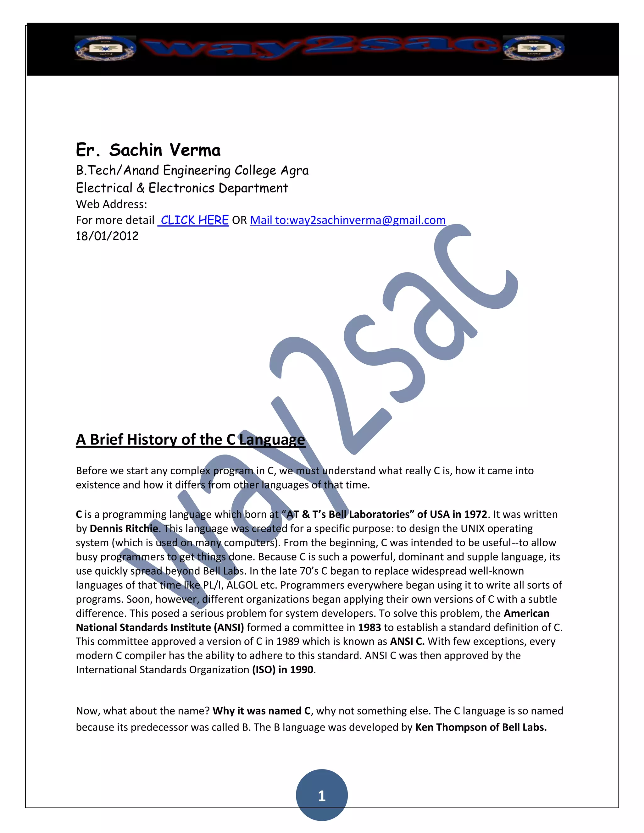 C is a programming language created in 1972 at Bell Labs to design the UNIX operating system. It spread quickly due to its power and portability. In 1989, ANSI standardized C to resolve issues from different compiler versions. C is an excellent choice for first programs due to its efficiency, flexibility, portability, and ability to write system software and packages. It has a rich set of data types, operators, and functions and allows extending functionality with custom functions. Variables are names for memory locations that can hold different data types and values.