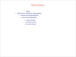 This document discusses trees as a non-linear data structure. It defines key tree terminology like root, parent, children, internal and external nodes. It also covers tree traversal algorithms like depth-first and breadth-first search. Algorithms are presented to calculate the depth and height of individual nodes and of the entire tree. The runtime of these algorithms depends on the structure of the tree but is typically O(n) where n is the number of nodes.