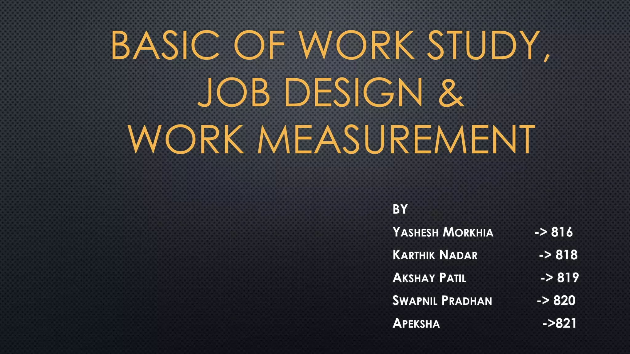 This document provides an overview of basic work study, job design, and work measurement. It discusses key concepts like method study, motion study, time study, work sampling, job rotation, job enlargement, and job enrichment. The document outlines the objectives, techniques, steps, and benefits of work study, which includes analyzing work methods, designing optimal work methods, and establishing standard times. It also discusses factors to consider in job design like layout, control, environmental conditions, and behavioral dimensions.