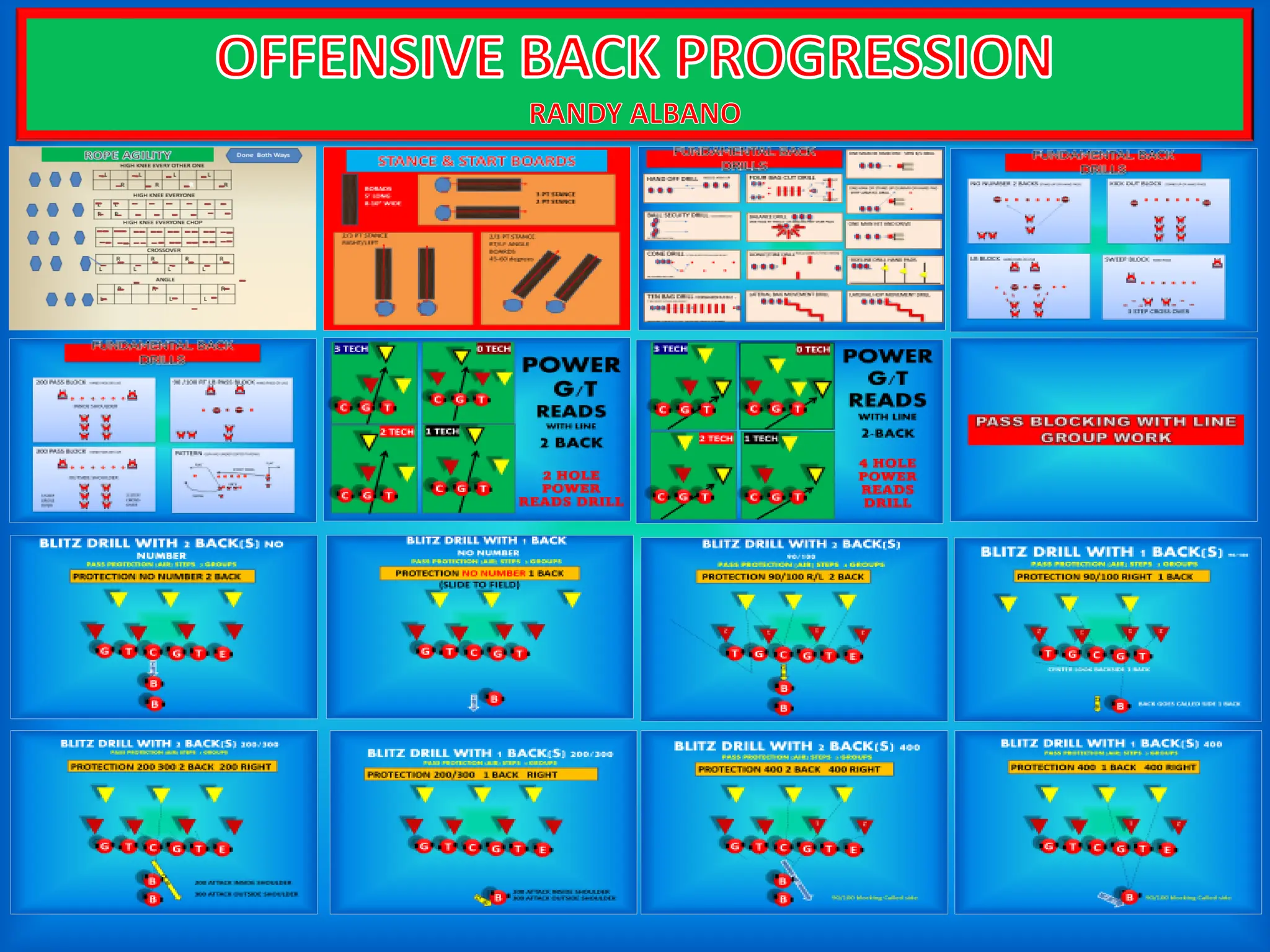 The document outlines various drills and techniques for improving offensive back progression and agility, including high knee maneuvers, crossover drills, and ball security exercises. It details specific drills for pass blocking and protections in different formations, as well as drills for tackling and blocking against defensive players. The content focuses on skill development through structured repetition and situational exercises.