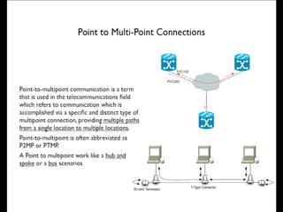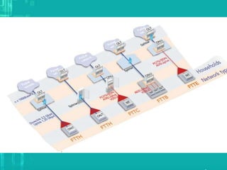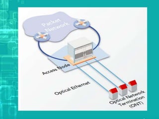 This document discusses different types of network connections and fiber optic technologies used for broadband access. It explains the differences between a hub, switch, and point-to-point vs point-to-multipoint connections. The document also provides details on Fiber To The X (FTTX) networks, including that optical network terminals (ONTs) or optical network units (ONUs) are used at customer premises to convert optical signals to electrical formats. Finally, it compares active optical networks (AONs) and passive optical networks (PONs), describing their components like the optical line terminal (OLT) and advantages/disadvantages of each type.
