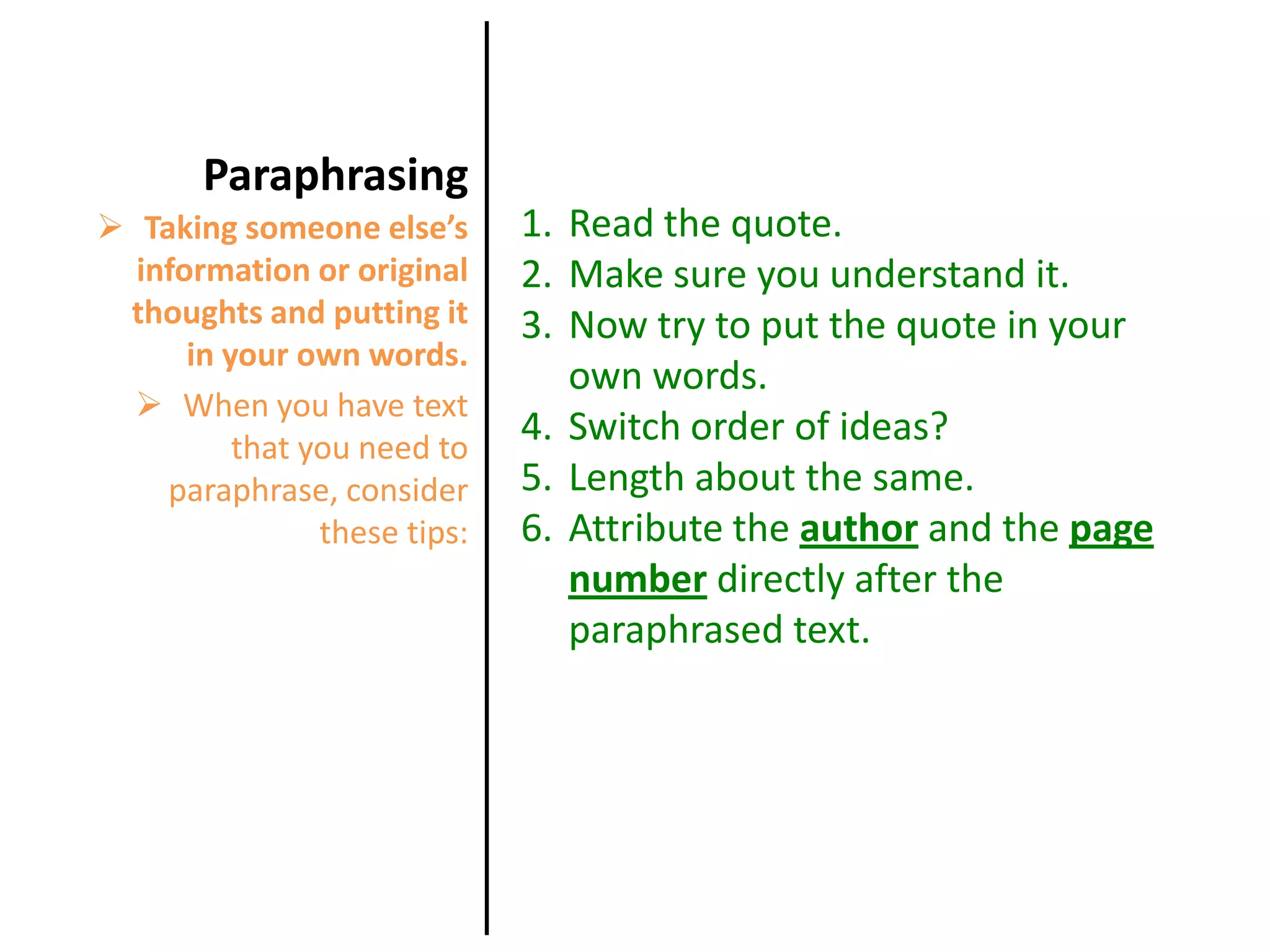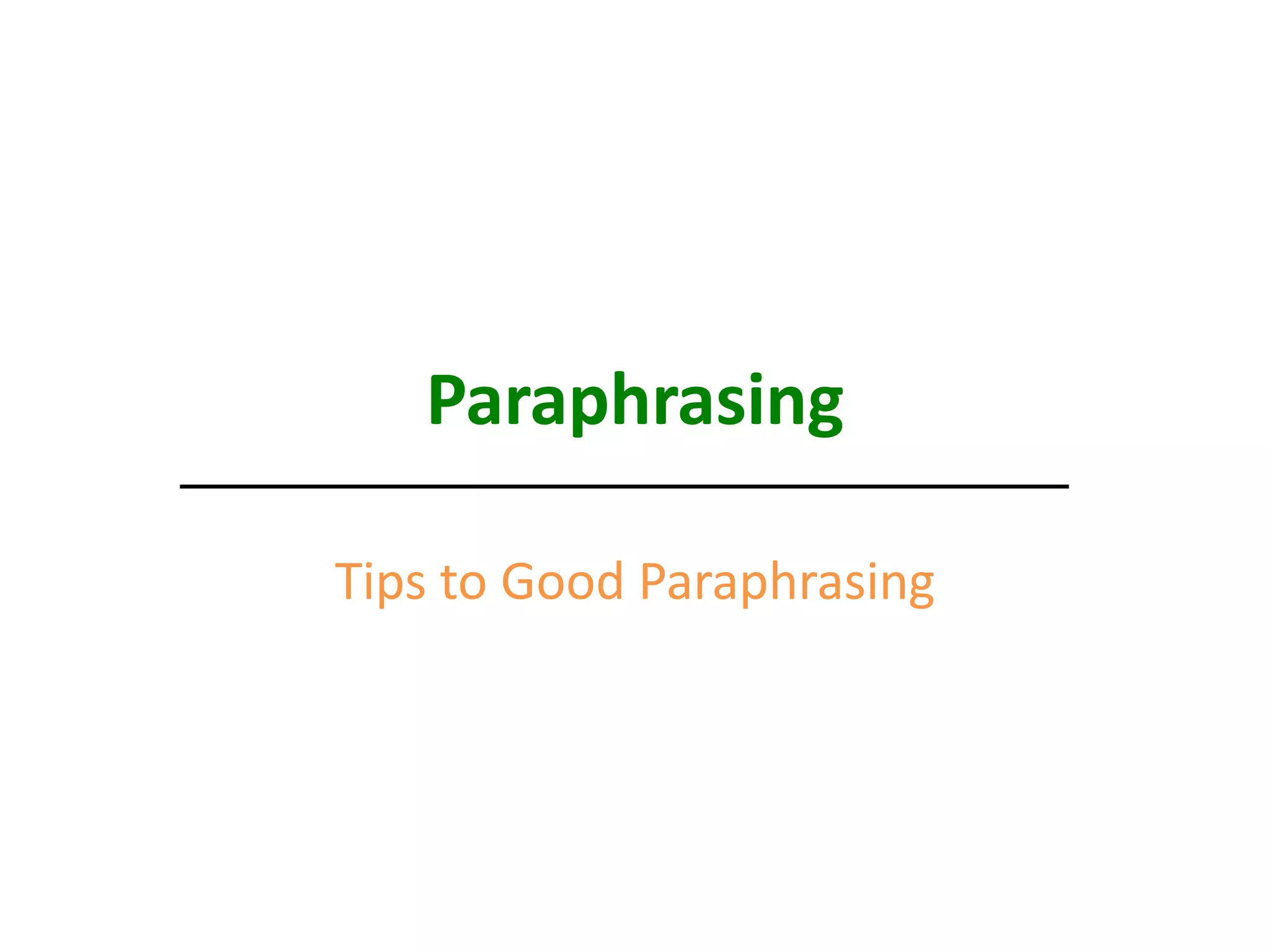The document provides tips for properly paraphrasing a quote or passage from another work. It advises to understand the original work, rewrite it in your own words while maintaining a similar length and order of ideas, and attribute the author and source. It cautions against minimal rewording or directly copying key parts of the original. An example paraphrase is provided and assessed.
