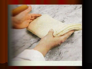 The document discusses different types of pastries including puff pastry, pâte brisée, and éclair paste. Puff pastry is a rich, buttery dough that bakes into hundreds of light, crispy layers through a process of rolling and folding layers of butter and dough. Éclair paste, also called pâte à choux, is used to make cream puffs and éclairs. It is leavened by steam instead of yeast and the dough is cooked before baking. Meringue is made from whipped egg whites and sugar and can be used to top pies or create baked goods.