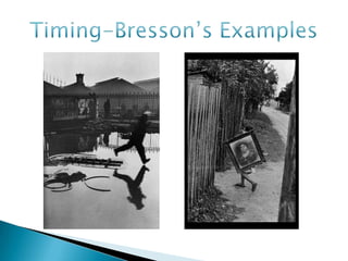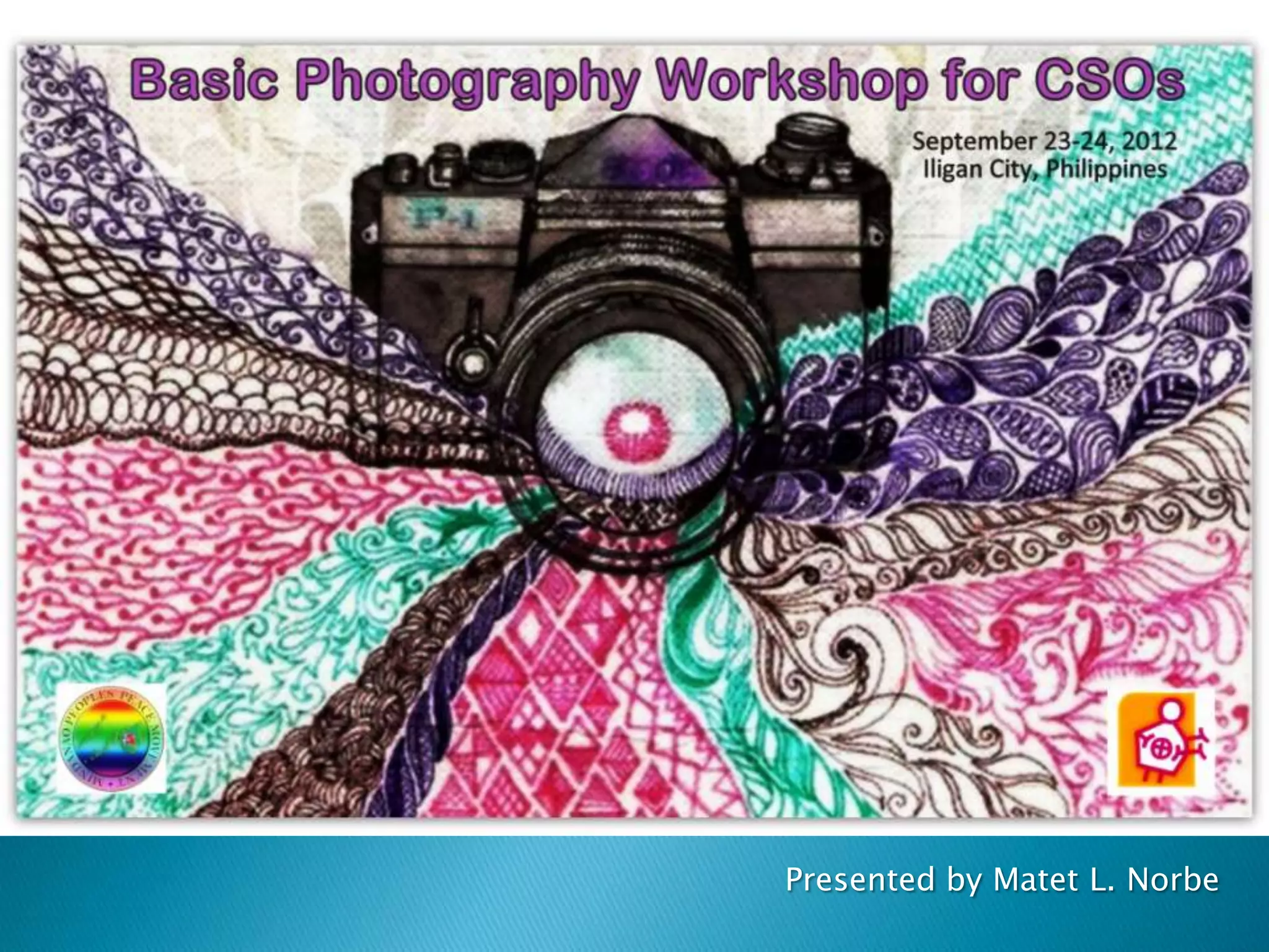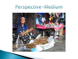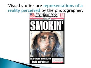 The document provides an overview of photography skills, experiences, definitions, composition principles, lighting, perspectives, and storytelling techniques. It discusses self-taught vs trained skills, personal vs organizational vs advocacy photography experiences, classic and postmodern photography definitions, elements of composition like subjects and framing, types of lighting, wide to close perspectives, and using photos, captions, and multimedia to tell stories. Ethical practices of accuracy, consent, and avoiding bias and manipulation are also covered.