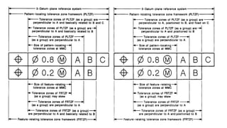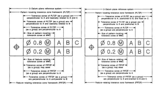 The document outlines the essential principles of Geometric Dimensioning and Tolerancing (GD&T) in accordance with ASME Y14.5 standards, focusing on metric and inch dimensioning rules. It discusses the significance of datum features, symbols, and the placement of feature control frames, particularly in relation to irregular surfaces and complex geometries. The emphasis is on maintaining clarity and precision in engineering drawings through appropriate notation and measurement conventions.