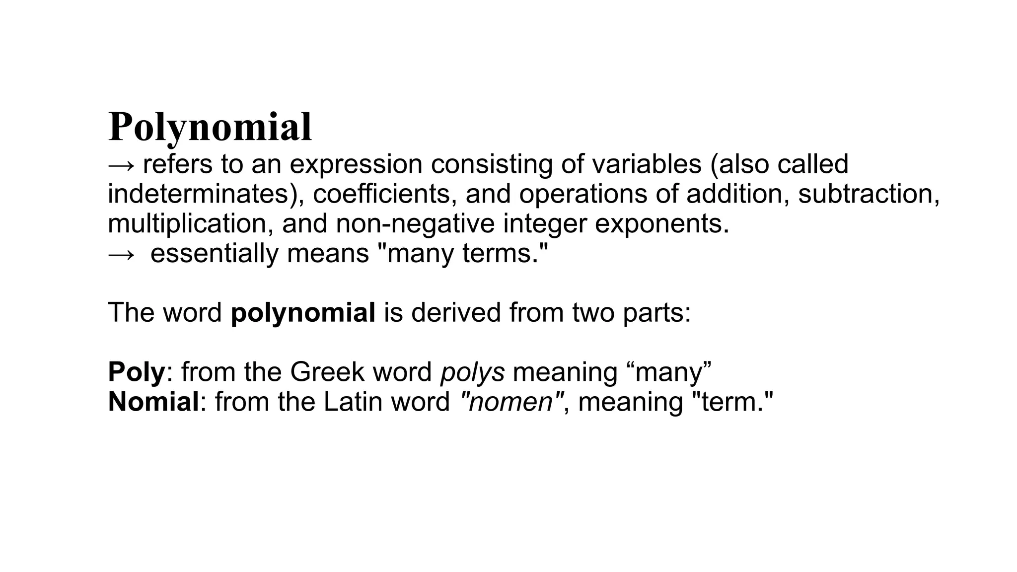 The word polynomial is derived from two parts: