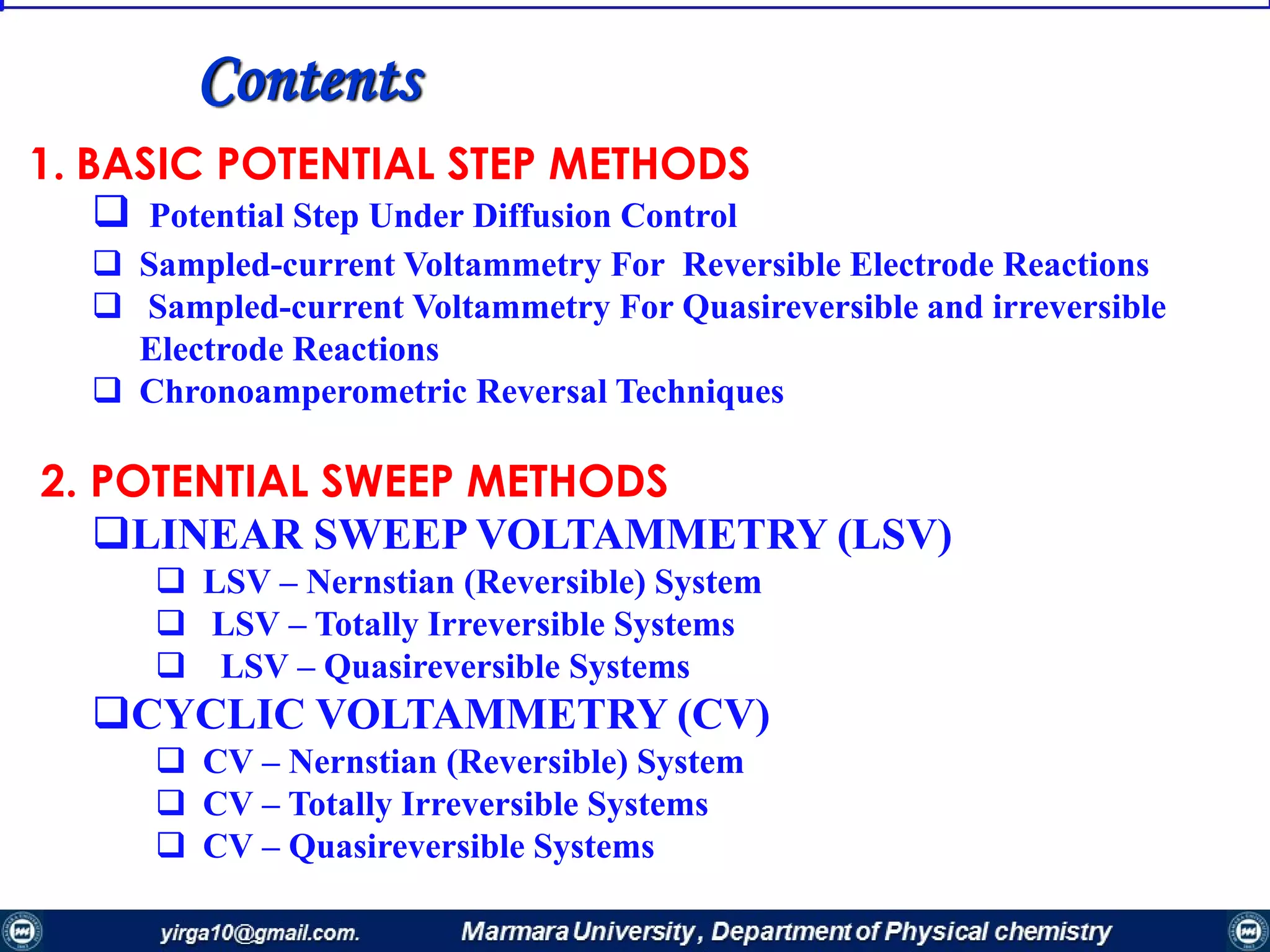 The document discusses various electrochemical techniques, including potential step methods and potential sweep methods for analyzing electrode reactions. It elaborates on current flow under different electrode conditions and the mathematical formulations for describing these processes, emphasizing the importance of diffusion and kinetics in electrode dynamics. Key equations like the Cottrell equation and their applications in reversible, quasireversible, and irreversible systems are also presented, alongside limitations and experimental considerations.