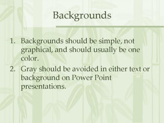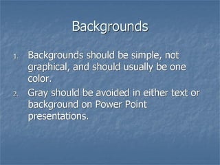 The document outlines essential skills for effective public speaking and presentation, emphasizing the importance of making a strong first impression and engaging the audience. It discusses communication dynamics, including the roles of body language, vocal variety, and emotional tone, while providing tips for starting talks, using visual aids, and ethically presenting content. Additionally, it offers practical guidance on PowerPoint techniques to enhance clarity and engagement during presentations.