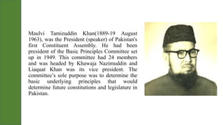 The document summarizes the key proposals of the 1950 interim report from the Basic Principles Committee in Pakistan. The committee, led by Khawaja Nazimuddin and Liaquat Ali Khan, was tasked with determining the basic principles for Pakistan's future constitutions. Its report proposed a federal republic with a bicameral legislature. It received criticism for giving unequal representation to East and West Pakistan and for making Urdu the sole national language. A revised 1952 report also faced backlash, leading to the adoption of the Muhammad Ali Bogra formula in 1953 to address representation issues.