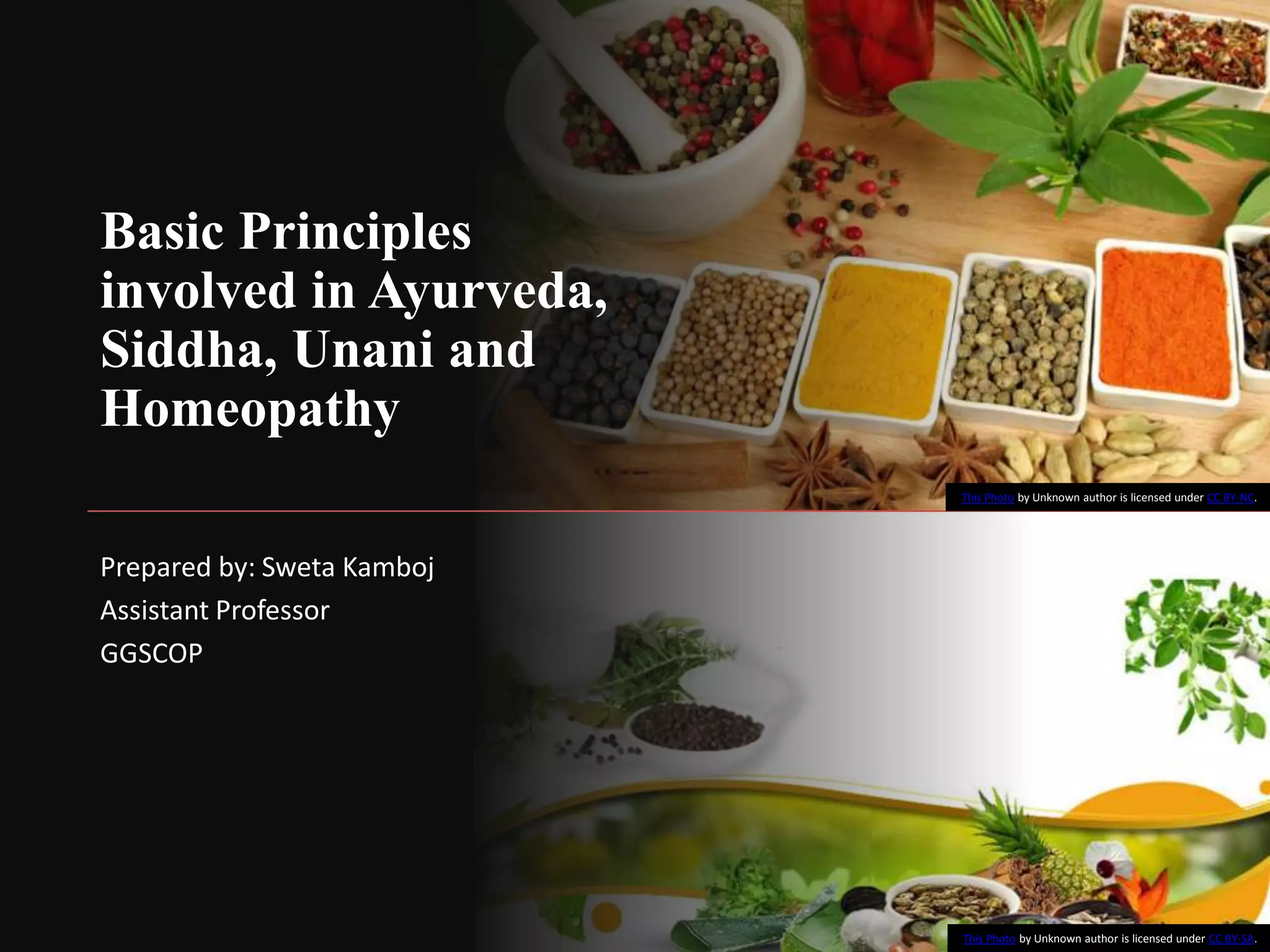 The document provides an overview of the basic principles of Ayurveda, Siddha, Unani, and Homeopathy systems of medicine. It discusses the key concepts in each system such as the Panchamahabhutas (five elements) and Tridosha theory in Ayurveda, Triguna and treatment methods in Siddha, humoral theory and diagnosis in Unani, and the principles of similars and minimum dose in Homeopathy. It also describes some common Ayurvedic formulations like Asavas, Aristas, Vati, Ghutika, Churna, Leha, and Bhasma and explains their preparation methods.