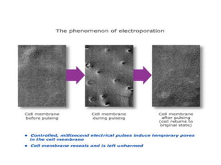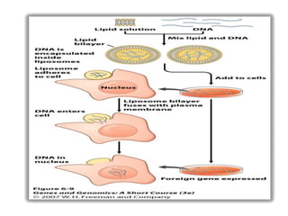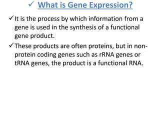 This document discusses gene expression and methods of gene transfer. It begins by defining gene expression as the process by which information from a gene is used to produce a functional product, often a protein. It then explains the central dogma of biology - that DNA is transcribed into RNA which is translated into protein. The document focuses on viral and non-viral methods of gene transfer, describing several types of viral vectors including retroviruses, lentiviruses, adenoviruses, and adeno-associated viruses. It also discusses non-viral methods such as electroporation, gene guns, oligonucleotides, and liposomes. Finally, it briefly mentions some applications of gene transfer technologies.