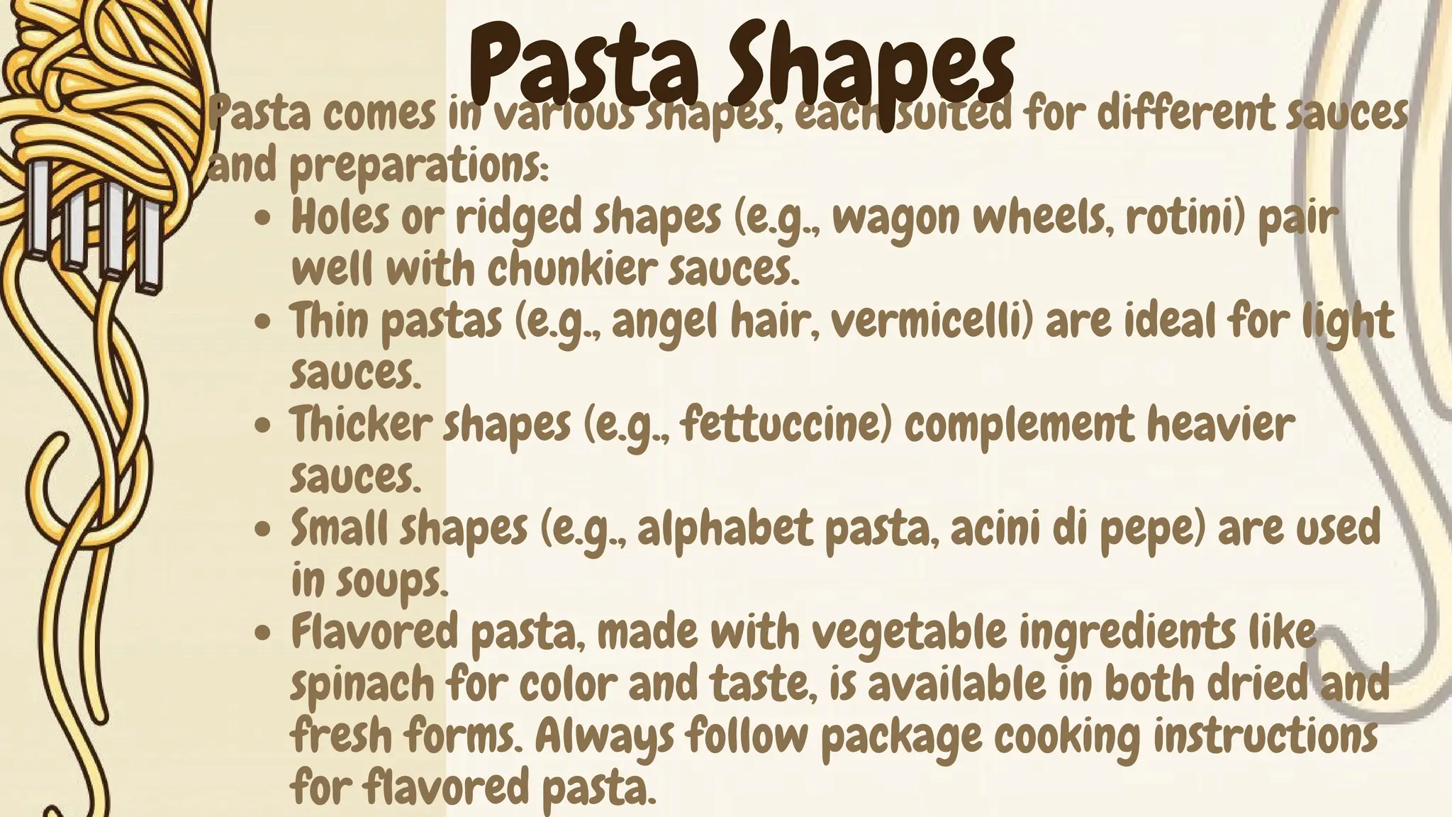 This document outlines the basic principles of preparing pasta, highlighting that different shapes are suited for various sauces and cooking times. It emphasizes the importance of cooking pasta al dente, using appropriate water, salt, and oil ratios, and offers guidelines for holding and cooling pasta for later use. Additionally, a cooking chart with specific times for different pasta shapes is provided to ensure proper preparation.