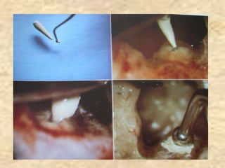 Endodontic surgery involves surgical management of periradicular pathosis. It includes procedures like abscess drainage, periapical surgery, corrective surgery, and root removal. The objectives are to remove causative agents of pathology, restore periodontal health, and provide a proper seal between the root canal and surrounding tissues. Periapical surgery may be indicated for anatomical issues preventing complete root canal treatment, restorative factors compromising treatment, root fractures with apical necrosis, retained materials, procedural errors, large periapical lesions not resolved by root canal treatment, or persistent symptoms after root canal treatment. Key steps involve flap design and reflection, periapical exposure, curettage, root-end resection, retrograde