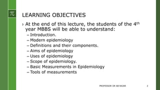 This document outlines key learning objectives for fourth-year MBBS students on the subject of epidemiology, including its definitions, aims, and essential concepts. It emphasizes the importance of epidemiology in understanding disease distribution, determining health-related states, and applying this knowledge to public health practices. Additionally, the document discusses basic measurements in epidemiology, such as incidence and prevalence, and their role in health status evaluation and disease prevention.