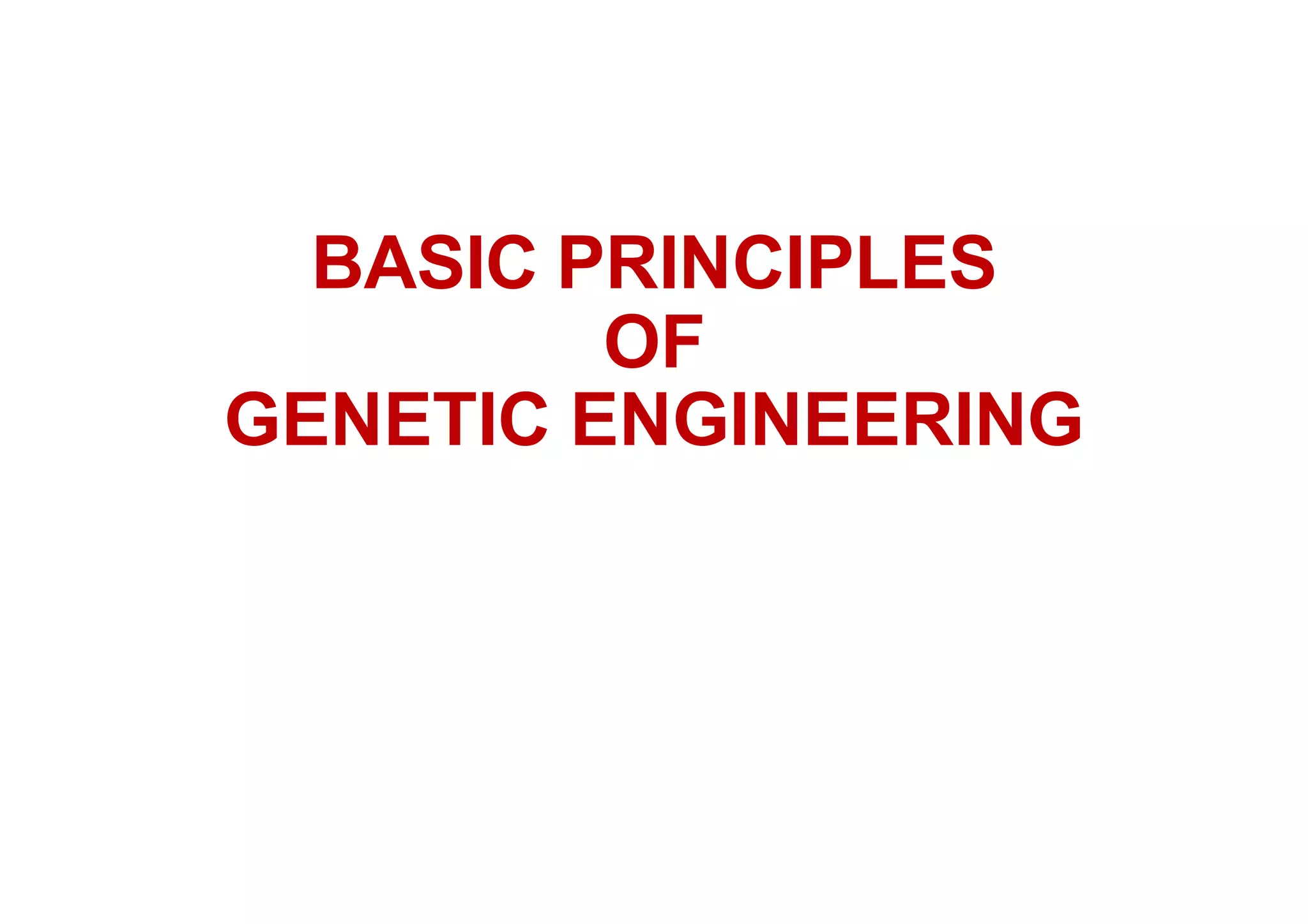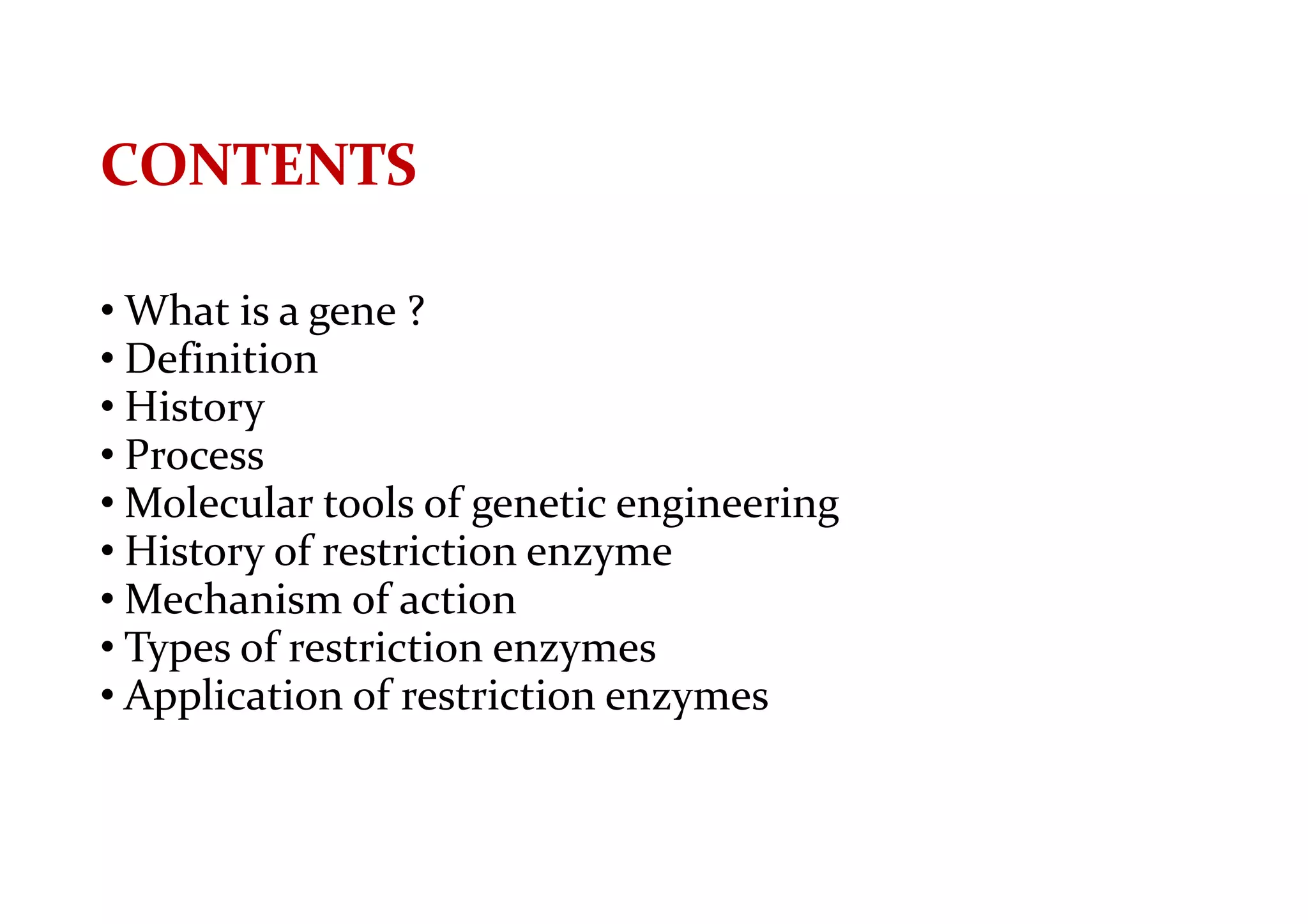 The document provides a comprehensive overview of genetic engineering, defining it as the manipulation of genes to produce desired traits in organisms, and discussing its historical development since the 1970s. It describes molecular tools like restriction enzymes and their applications in creating genetically modified organisms (GMOs) and transgenic animals, as well as processes such as insulin production. Additionally, the document outlines the mechanisms of action for various types of restriction enzymes and their significance in biotechnology.