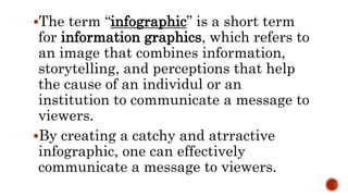 An infographic is an image that combines information, storytelling, and perceptions to communicate a message effectively. It uses various design elements like lines, shapes, colors, and their arrangement to catch viewers' attention regardless of their background. Creating a balanced composition with formal or informal symmetry using these elements with proportion and rhythm helps ensure the infographic's message is understood. Common file formats for infographics include JPEG, TIFF, GIF, and PNG, each with their own compression techniques and capabilities.