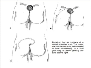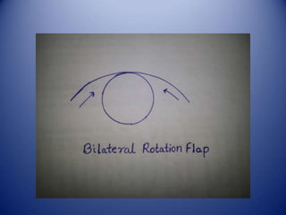 2) Key classifications include random pattern flaps which rely on subdermal plexus, and axial pattern flaps named after a source artery. Advancement, pivot, and interpolation flaps are classified by their movement.