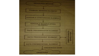 This document discusses basic principles of measurements. It defines key terms like measurement, instrument, measurand and describes different types of measurement methods, standards, and performance characteristics of instruments. Specifically, it outlines direct and indirect comparison methods of measurement and discusses primary, secondary and working standards. It also categorizes instruments as mechanical, electrical, electronic; and defines static performance characteristics like accuracy, precision, error, range and resolution.