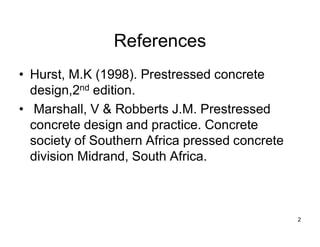 The document provides an overview of prestressed concrete design, including its historical development, basic principles, and primary applications such as bridges and floor systems. It outlines two main methods of prestressing—pre-tensioning and post-tensioning—along with their advantages and disadvantages, emphasizing the importance of quality control during construction. The document also discusses allowable stresses, internal equilibrium, and safety measures related to prestressed concrete structures.