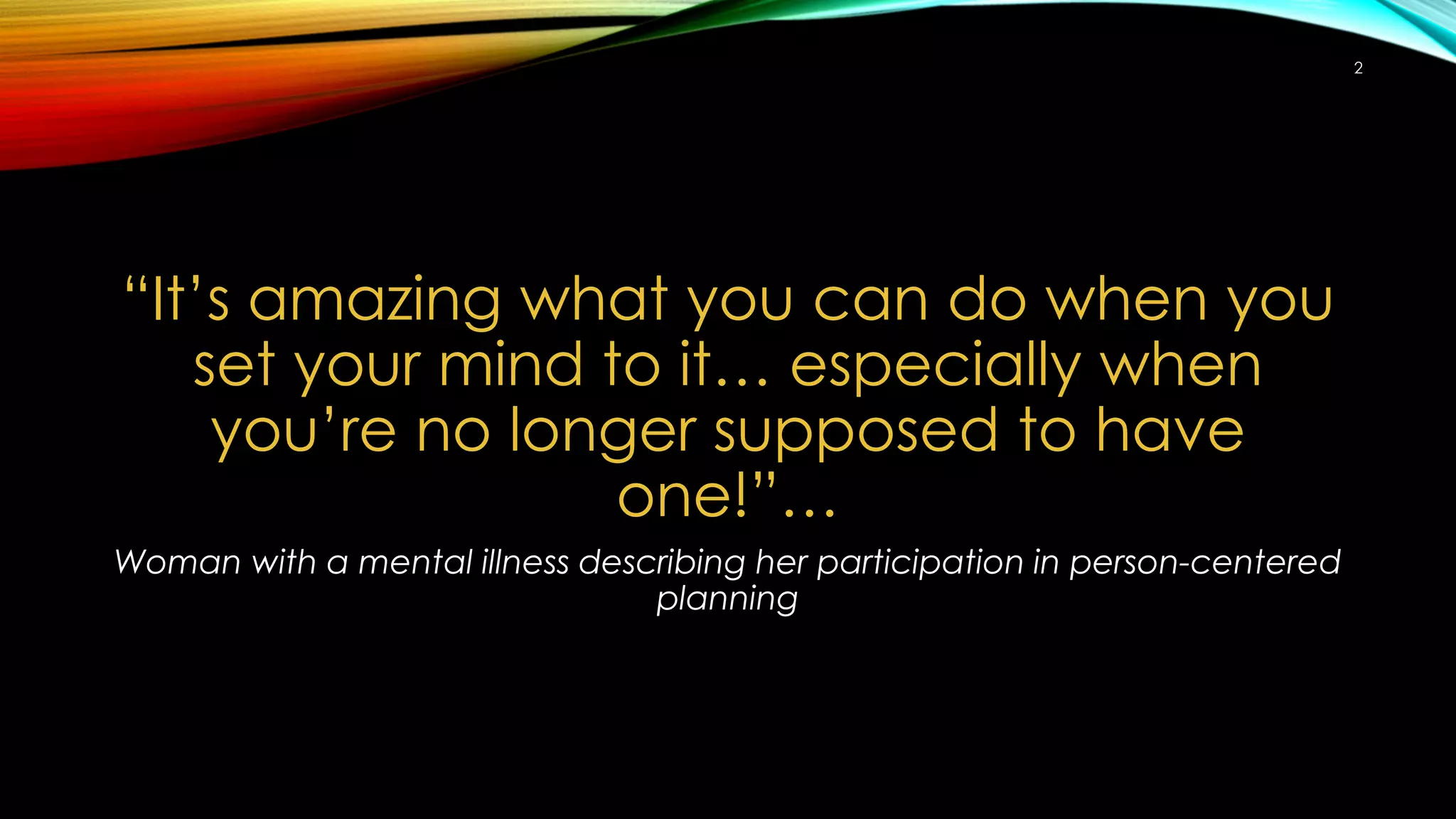 The document discusses the principles of person-centered care and treatment planning. It emphasizes that person-centered care (1) promotes recovery over illness minimization, (2) is based on the individual's own goals and choices, and (3) involves collaborative decision-making between the individual and their supports. In contrast, traditional treatment focuses on compliance, deficits, and clinical stability rather than self-determination and quality of life. The most common mistake made is assuming the provider knows best rather than including the individual. Person-centered practice speaks in strengths-based terms, addresses barriers rather than pathologies, and views the individual-provider relationship as a partnership.